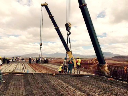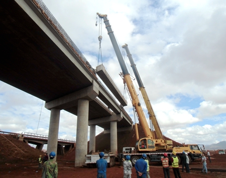 为确保空心板梁安全顺利吊装,蒙内四标在九月中旬就针对空心板梁吊装施工,对经验欠缺的肯方员工进行了多次严格地手把手技术、安全交底,精心组织好人员、设备等,并对存梁和吊车施工区域进行清理、平整。吊装期间,项目领导、工区经理、技术负责人、安全、设备等全程现场监控每一块空心板的吊装。在吊装跨越既有米轨的第4联空心板梁之前,项目部在两级公司和总指的大力帮助下,通过多次与肯尼亚铁路运营商RVR进行沟通,取得了RVR铁路运营商的吊装许可,并最终确定第4联吊装的时间为2015年10月8日、9日7点至11点,从而开通了两天共8小时的宝贵吊装时间。项目部同时分别在吊装处两端的苏丹镇和辛巴镇专门安排安全员值班,随时监测火车动态,确保了架梁工作安全有序进行,最终实现了该桥的顺利贯通。