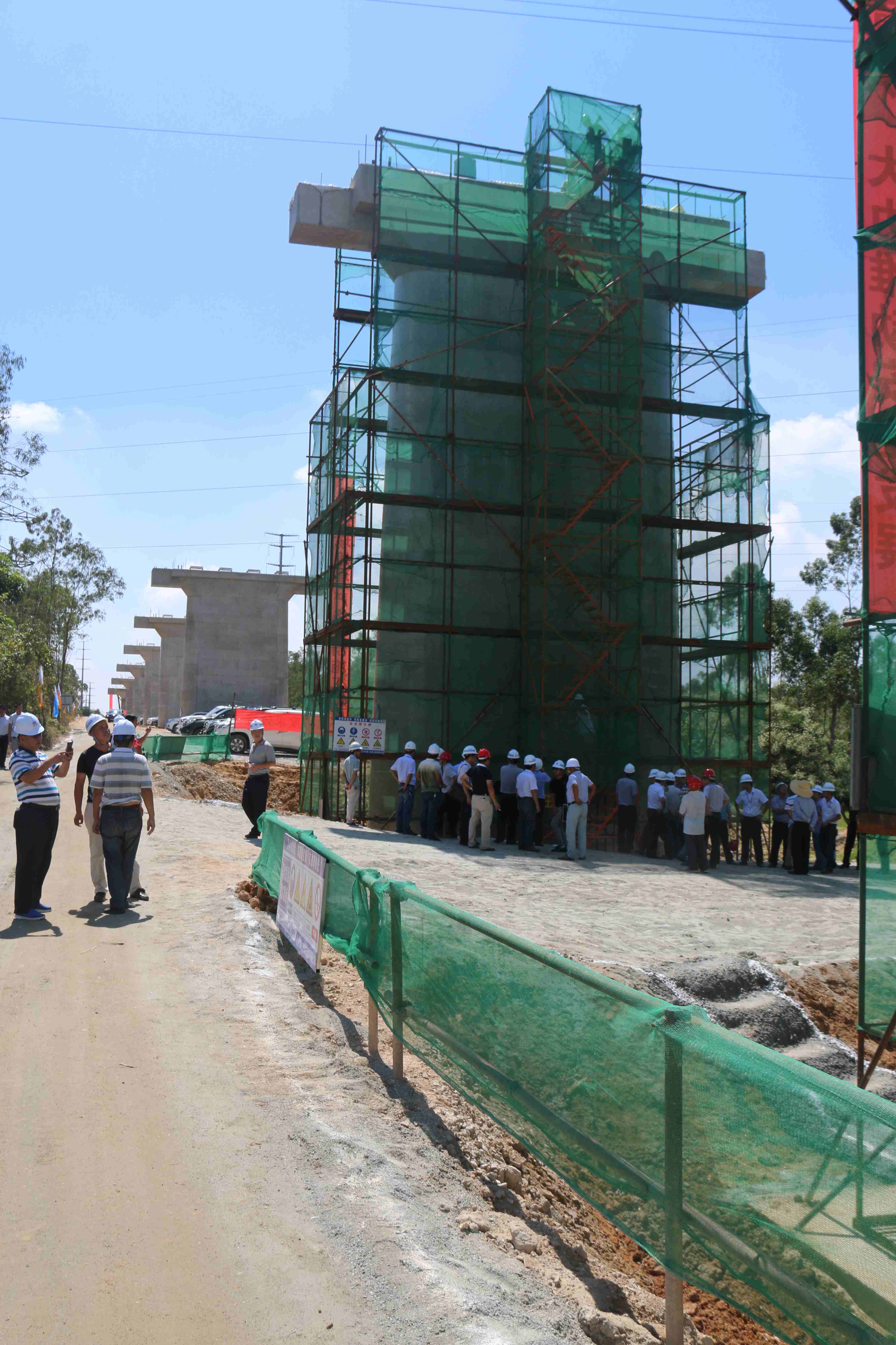 在那龙河2#特大桥和阳阳高速特大桥施工现场,观摩团听取了项目有关工程概况、施工工艺、标准化管理等方面的介绍,现场观摩了承台、墩身施工。现场标识标牌林立、材料堆码整齐有序、作业人员操作规范、墩身美观。观摩人员不断交流询问、纷纷拍照记录。观摩中,墩身装配式脚手架引起观摩团的兴趣。深茂铁路六标引进的装配式支架采用高螺栓连接,并在平台底端加设防落钢丝网,确保施工安全。较传统扣件式脚手架缩短了装拆时间、降低了成本,且提高支架稳定的安全系数。