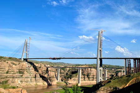 准格尔黄河特大桥起点位于呼和浩特市清水河县黄河东岸,终点位于鄂尔多斯市准格尔旗境内,是荣乌高速公路内蒙古段技术含量最高、施工难度最大的项目,也是全线的关键控制性工程。大桥全长1277米,为双塔双索面预应力混凝土斜拉桥,主跨440米,最大塔高228.6米,被誉为“内蒙古第一斜拉桥”,由中交二航局承担大桥施工任务。