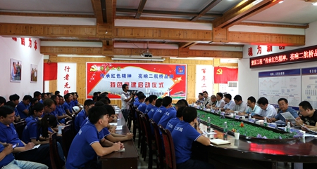 “以红色精神发挥党支部的战斗堡垒作用;以红色精神引领全体员工把乌江大桥建成精品工程、示范工程、标准化工程;以红色精神传承二航局在贵州市场十六年的用心经营;以红色精神感恩贵州人民对二航人的信任”。6月28日,在建党94周年即将到来之际,乌江特大桥项目部隆重举行了特色党建“燎原工程”启动仪式。分公司党委书记张文胜、组织部长李竞、纪委监察办公室主任王永朕、贵州高速公路集团有限公司遵贵扩容项目办党委书记戴顺红、遵义县兰海高速遵贵扩容工程协调指挥部指挥长罗吉胜、遵义县档案局局长、党史办主任杨生国、遵义县兰海高速遵贵扩容工程协调指挥部主任杨天文、遵义县尚稽镇党委书记刘华及项目部全体员工出席了启动仪式。