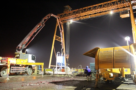 两名工作人员将地泵逐步摆正,天泵操作手轻拨遥控,两根导管如定海神针竖立集料斗顶端,随后,机器轰隆轰隆运转,混凝土一倾而下,6月12日晚21点30分,沌口大桥4号主墩5号桩——最后一根桩开始浇筑,经过5个小时的连续作业,顺利完成浇筑,自此,武汉沌口长江公路大桥主墩桩基施工全部完成。