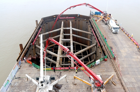 沌口长江公路大桥是公司在长江上建设的单体最大的桥梁,大桥连接武汉市四环线西、南段,是四环线工程的重要组成部分和跨越长江的关键控制性工程之一。据了解,目前正在顺利施工中的沌口大桥3号主墩,较原计划提前了一周时间,于4日早上6点开始了第一层承台浇筑工作。浇筑由3台天泵和8台罐车同时进行,每小时能浇筑混凝土90方,约需要40个小时完成第一层承台3842方混凝土的浇筑。