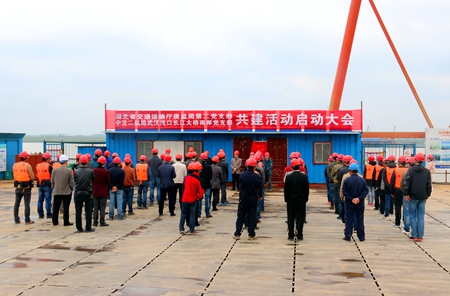 启动大会在沌口大桥4号主墩平台上举行。会上,沌口大桥项目经理介绍了项目近况,质监局第二党支部书记黄国强宣读了创建方案, 南岸分部党支部书记汇报了进度、安全、质量、文明施工、创优等五项创建目标。随后,胡焰华书记和莫汉清书记为党员代表发放了“党员明白卡”,并共同为支部共建基层办公室揭牌。