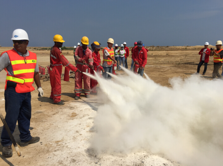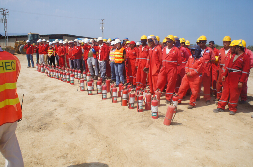 在项目安全总监的统一部署下,演习活动顺利拉开帷幕,活动现场,中委员工全体严守以待,首先由委方安全员向全体人员讲解干粉灭火器的使用方法以及日常维护检查注意事项,并进行操作示范;中方安全员在开阔地带准备好洒满汽油的柴堆,随后,中委两方人员利用灭火器,进行消防演练的模拟操作。整个演习过程中,消防车在现场随时候命,在确保消防演习安全性的同时,也突显出项目部对消防安全的重视性。