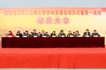 当日上午10点,武汉沌口长江公路大桥举行了劳动竞赛启动仪式暨第一战役动员大会,武汉市总工会经济部部长吴珊,公司党委副书记、纪委书记、工会主席肖继生、工会副主席许世勇、机关党委书记、企业文化部副总经理陈同尧,分公司党委书记张文胜、党委副书记龚远军、纪委书记、工会主席姚本思,武汉中交沌口长江大桥投资有限公司总经理方卫东、党工委书记莫汉清等领导出席动员大会。大会由莫汉清主持,张文胜致欢迎词,业主、设计、监理、施工以及协作单位近百余名劳动者共同吹响劳动竞赛第一战役的号角。