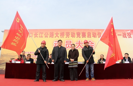 1月9日上午,武汉沌口长江公路大桥项目驻地旗帜飘扬,争创党员示范岗、争创工人先锋号、争创青年文明号、争创青年安全示范岗、青年突击队等旗帜的授予,标志着劳动竞赛正式启动,竞赛第一战役将力争实现2015年7月1日前完成大桥3号、4号主墩承台的施工目标。