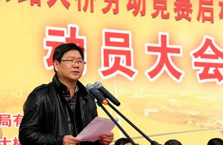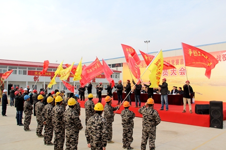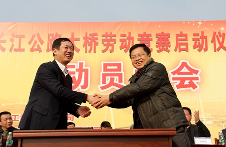 动员大会上,项目公司副总经理李芳武宣读了大桥建设期间各阶段的主要目标,同时项目经理汇报了劳动竞赛第一战役的实施方案。随后,项目公司与项目部签订了《劳动竞赛责任书》,项目经理与分部代表签订了《劳动竞赛第一战役责任书》,项目书记宣读了《劳动竞赛第一战役倡议书》。最后,授旗仪式的举行拉开了劳动竞赛的帷幕。