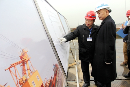 当日上午,伴随着施工现场机器运转的轰鸣声,陈云一行在该桥3号主墩平台见证了沌口大桥的正式开工。随后,沌口大桥项目经理手持图纸,为中国交建副总裁陈云讲解了该项目总体情况,并在施工现场就该项目的特点及难点做了重点介绍。在4号主墩平台,陈云实地考察了该桥最高主塔钢围堰的施工情况,并通过水下摄影设备观看了钢围堰的水下施工动态。