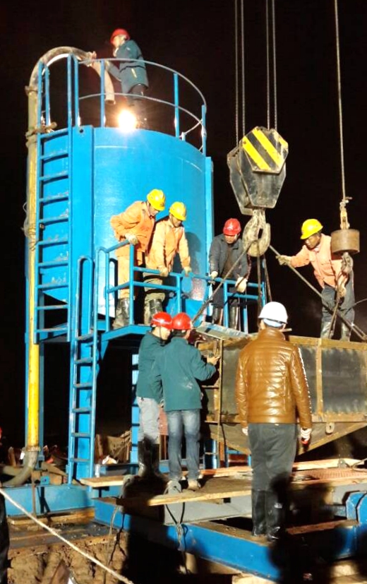 根据严密的施工组织设计方案,桩基施工将严格按照钢护筒埋设、钻机就位钻进成孔、一次清孔、安放连接钢筋笼、安放导管、二次清孔、浇筑水下砼、桩身质量检测的施工工序进行。11月9日上午约9点半,桩基施工的重要工序——88号桩第1和第2节钢筋笼对接成功,11月10日凌晨两点,88号桩基得以顺利完成浇筑。