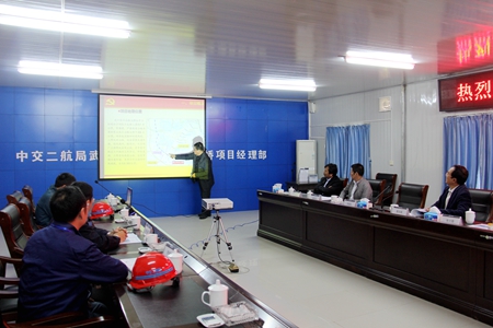 在项目部会议室,项目经理就项目规模、管理模式、技术重难点、当前施工情况等作了全面介绍,并重点讲解了本月顺利下水的钢围堰技术工艺和施工情况,展示了钢围堰下水的航拍影像资料和项目动画。晋志毅一行对钢围堰技术工艺大加赞赏,并鼓励进行进一步推广。