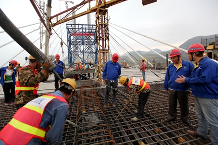 10月1日,在国庆65周年来临之际,湖南汝郴高速赤石特大桥主7号墩最后一跨主梁胜利完成,向祖国母亲送上一份生日大礼。 金秋十月,收获的季节。9月30日下午,项目书记来到大桥施工现场,慰问国庆假期仍坚守岗位的一线员工,感谢他们的辛勤工作和付出。10月1日凌晨1点半,历经10个半小时,赤石特大桥7号主墩最后一跨现浇主梁浇筑完毕。至此,赤石大桥主七号塔23个悬浇梁段全部胜利完成浇筑,为整座赤石特大桥按期顺利合龙奠定了坚实基础。