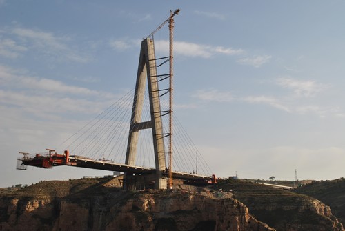 准格尔黄河特大桥起点位于呼和浩特市清水河县黄河东岸,终点位于鄂尔多斯市准格尔旗境内,是全线技术含量最高、施工难度最大的项目,也是荣乌高速公路关键的控制性工程。大桥全长1277米,为双塔双索面预应力混凝土斜拉桥,主跨440米,最大塔高228.5米,被誉为“内蒙古第一斜拉桥”。