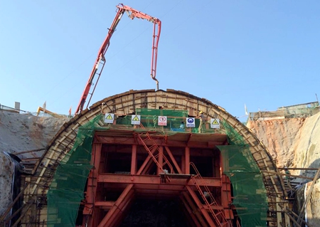 10月2日晚11点,沉睡的群山包围下,灯火通明的三工区拌和站依旧忙碌,假日期间也无半分松懈。工区经理带领技术员们实行24小时轮班制,做到人休机不停,连续作战,于10月5日晚11点,成功浇筑大屋基明洞首件二衬。