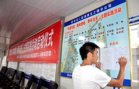 仪式由项目经理主持,分公司团委书记陈粲宣布活动正式启动。项目团支部书记汪涛代表全体青年员工就“青年当先、厉行节约、人人行动”做公开承诺,项目青年代表纷纷在承诺书上郑重签字。