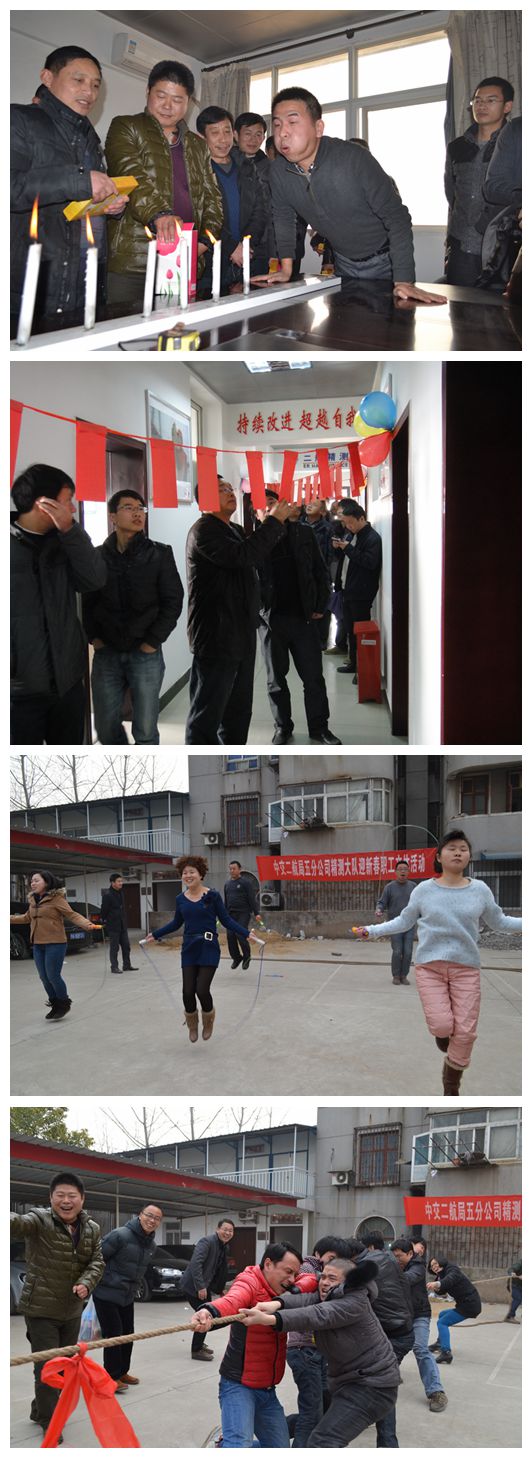 1月27日,辞旧迎新之际,精测大队为使职工们度过一个喜庆、安乐、祥和的节日,开展了猜谜语、吹蜡烛、跳绳、拔河等“迎新春”文体活动。来自基层各项目的测量人员齐聚大队本部参加了这次活动,通过此次活动丰富了测量人员的文化生活,增强了凝聚力和向心力。