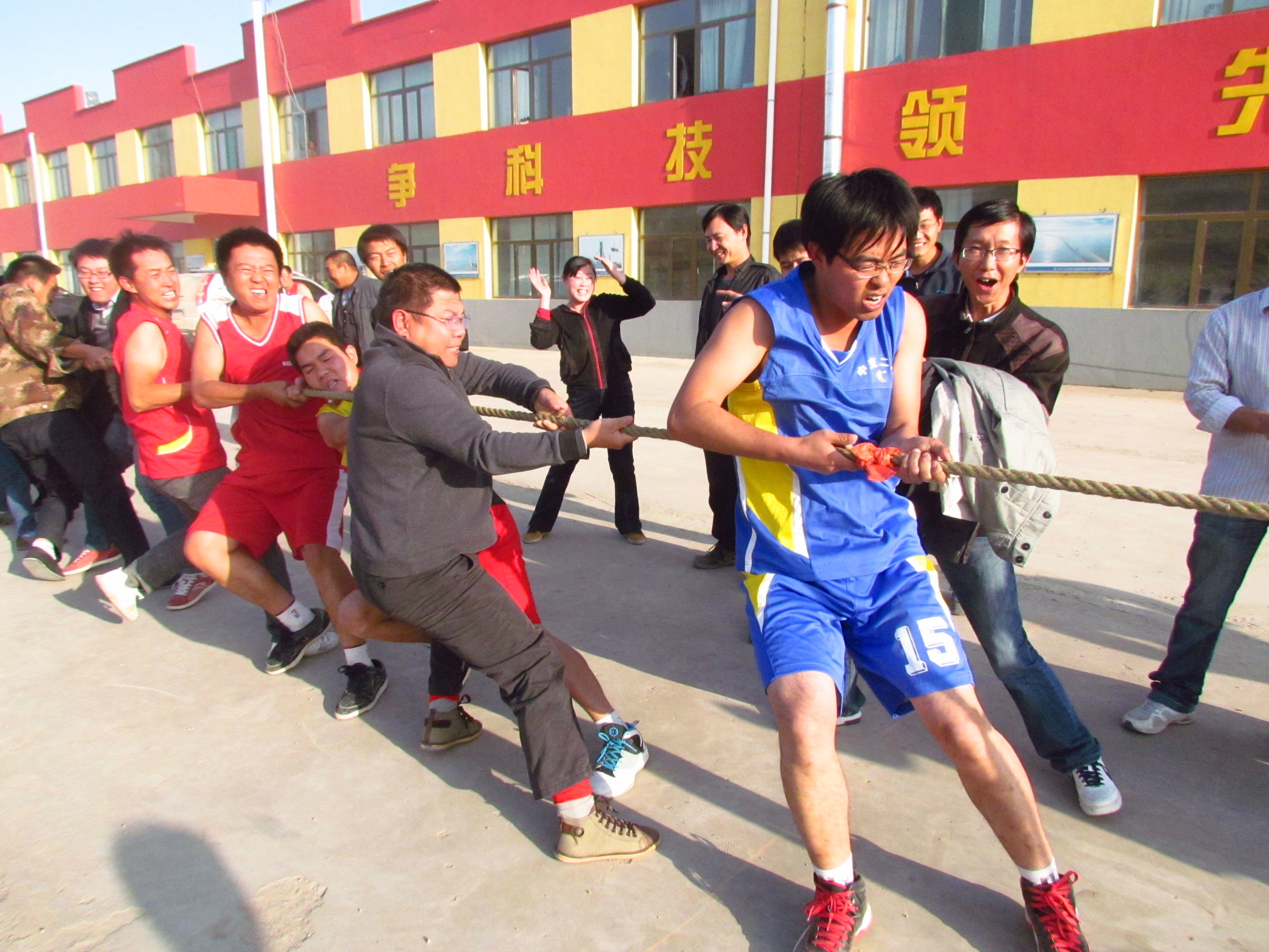 当天下午,项目部首先举行了一场“灰太狼队”VS“跳跳虎队”篮球友谊赛,最终恶狼不敌猛虎以小比分落败。接着项目部全体职工分四组开展拔河比赛,项目经理姜永生任队长的老姜队在先输一局的危险形势下进行战前动员:要是今天没拿到第一名今晚的饭钱就你们掏!老姜队队员顿时士气大振连克劲旅,最终以人人腰酸背痛腿抽筋的辛勤付出摘得桂冠。同时项目部还开展了员工摄影展和套环游戏。