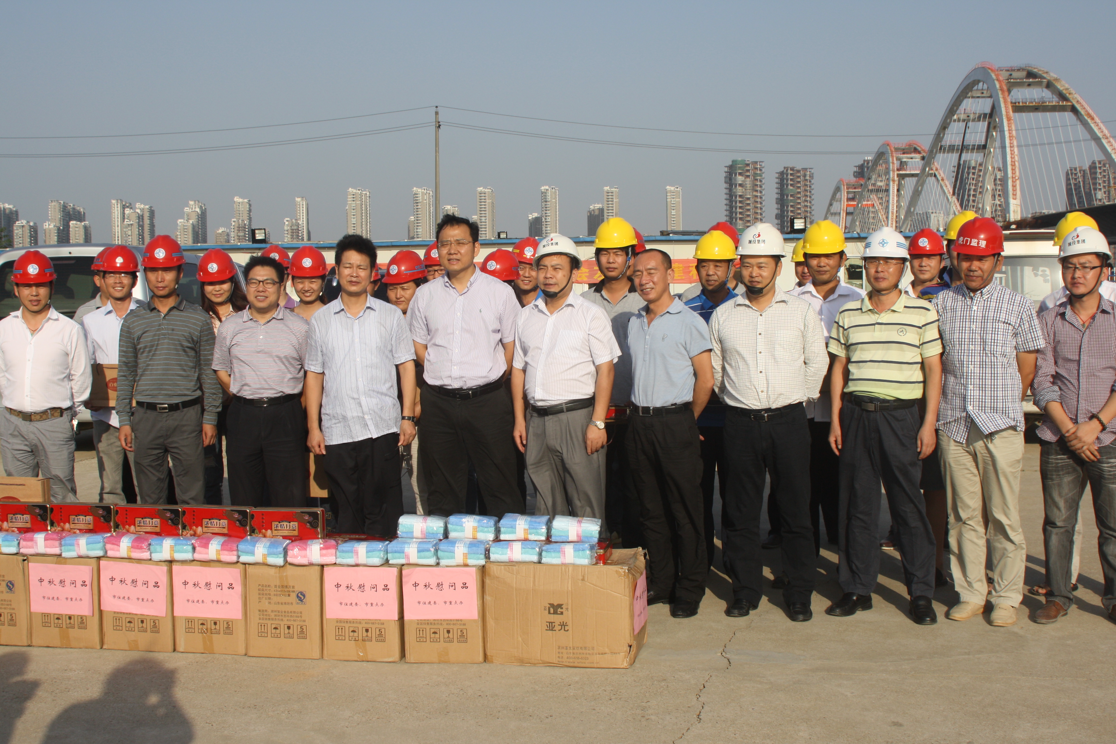 2012年9月28日,长沙市政府副秘书长涂文清等领导一行莅临福元路湘江大桥项目部对项目部员工进行了中秋佳节的慰问。长沙城投公司领导及项目经理、项目书记带领全体职工统一佩戴中交二航安全帽,列队欢迎,表示感谢。