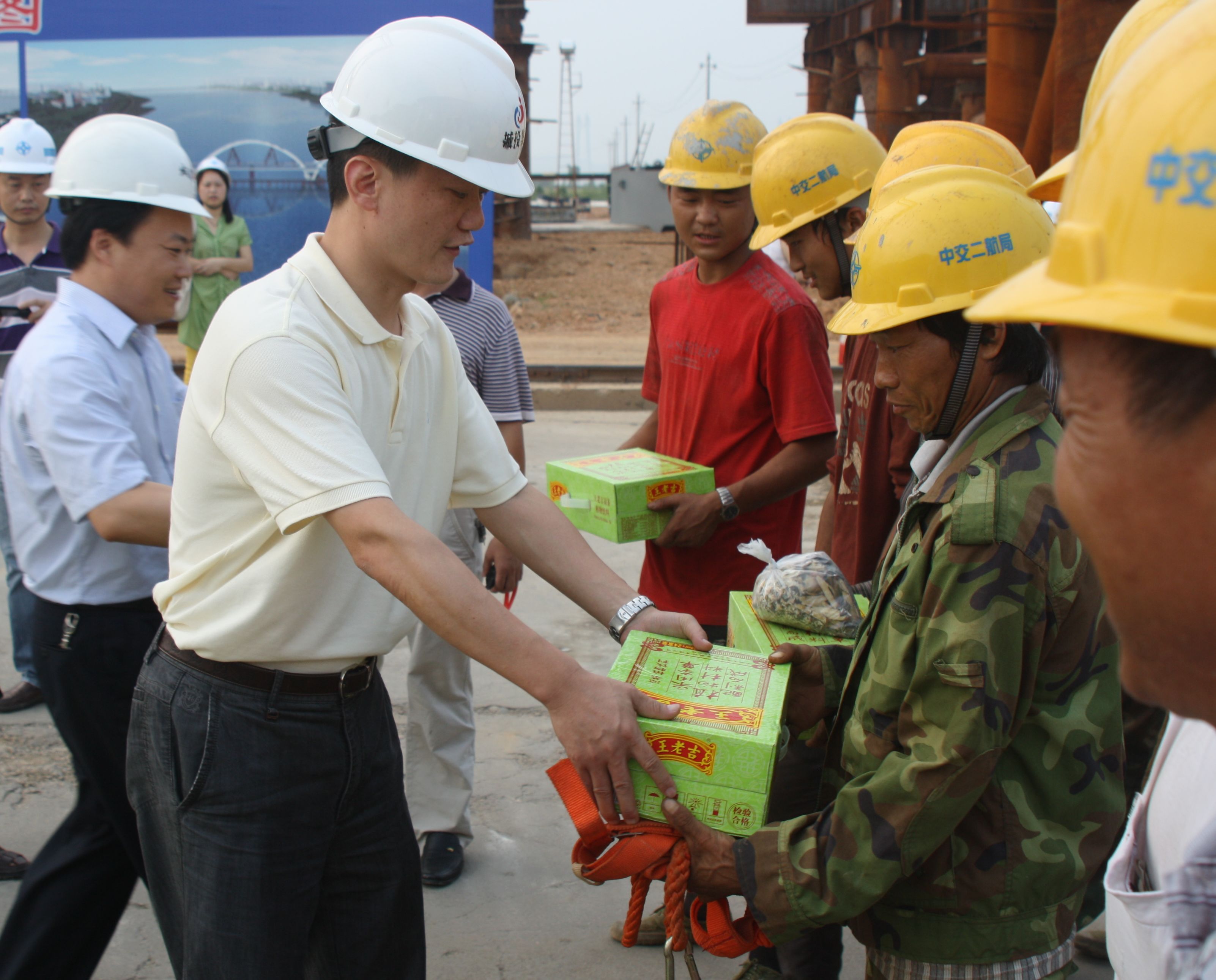 “同志们辛苦了!”、“天气太热了,你们在施工的时候一定要注意身体”。这是宋副局长一行将慰问品亲自送到一位农民工手上时说的话,从会议室出来,顶着酷暑高温,宋副局长等领导一行在业主代表及项目领导的陪同下,来到福元路湘江大桥工地慰问一线农民工,送上凉茶和防暑药品的同时,也把党和政府的温暖和关怀送给了他们。