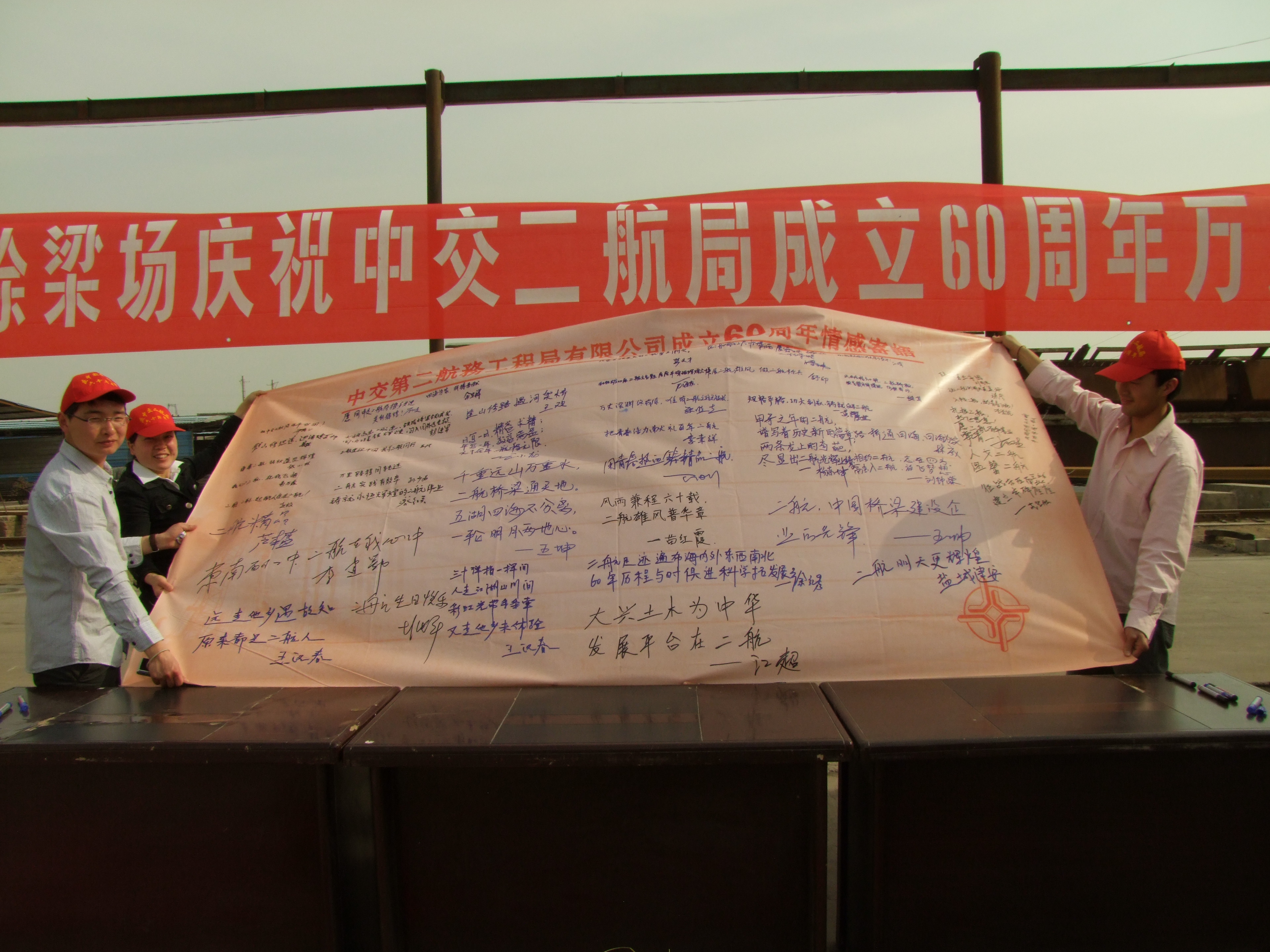 针对此次活动,项目部精心策划组织,制作了宣传横幅和绣有“庆中交二航局六十周年”字样的红帽,向上级单位、兄弟单位和协作队伍发出诚挚邀请,事先统计员工感言,举办正规签名仪式,仪式在奏响《二航之歌》声中开始,对整个过程进行了摄影录像。今后,项目部将继续认真完成好局庆60周年的各项活动,项目部全体员工为二航局60年的辉煌而骄傲,更为二航百年梦圆而努力奋斗。