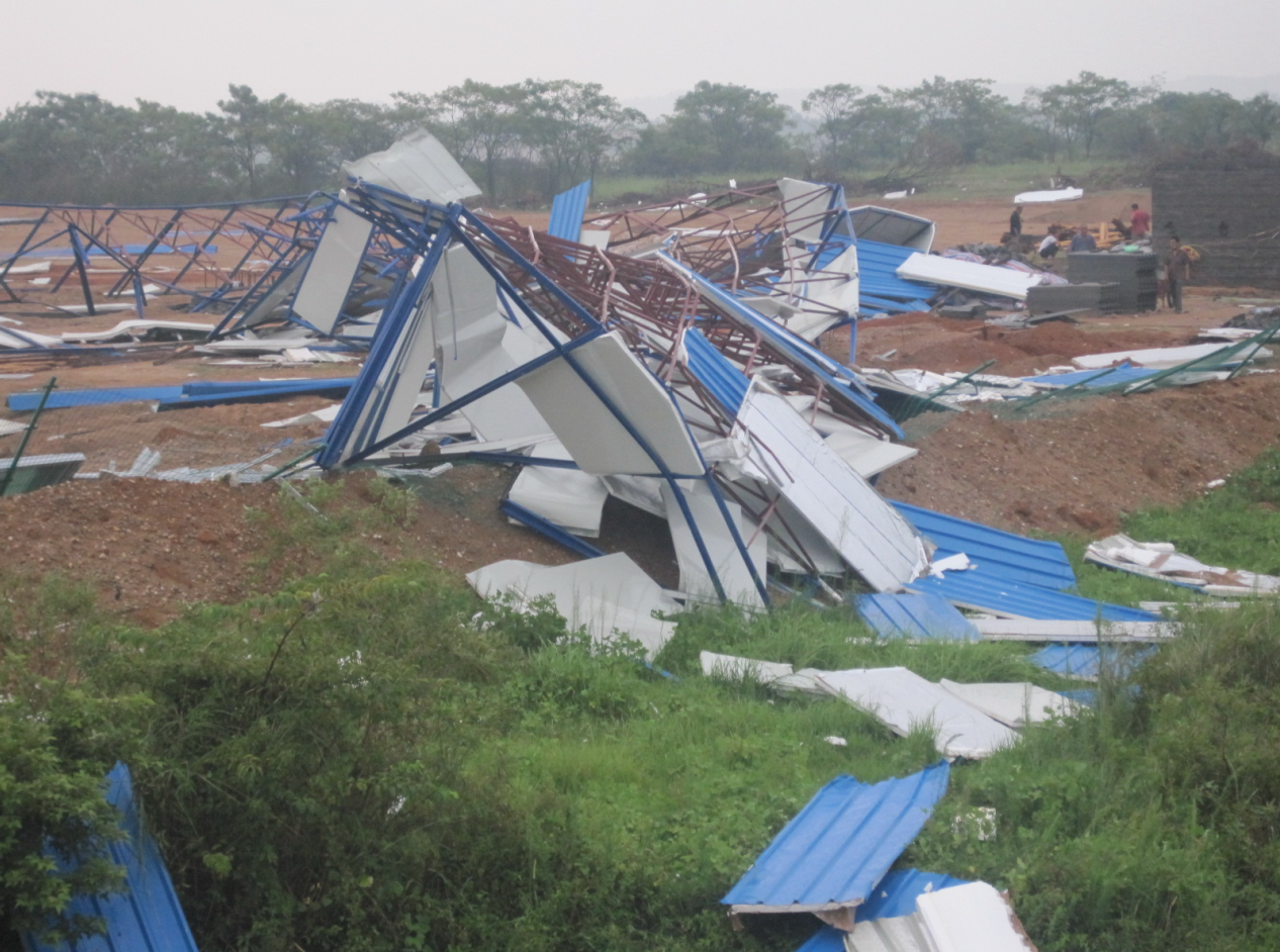 8月23日16时30分左右,中交二航局赣江石虎塘W5标项目部突遭强阵风及暴雨袭击,暴风雨持续了半个多小时,项目部办公及生活区部分房屋、通道被雨水淹没,施工现场一片狼藉,整排的活动板房遭暴风雨袭击后,全部倒塌,搭建的临时水泥库房棚顶都被狂风掀起,水泥散落一地,各种线缆、设备、及安全标识牌均被狂风吹倒,施工作业人员及时得到疏散,施工现场无任何人员伤亡。这次突降的暴风雨,给石虎塘项目部造成严重的经济损失,具体损失目前还在进一步的统计之中。