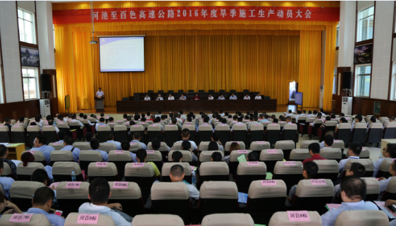 下午,动员大会在河池市巴马县政府会议室召开。会议传达了河池至百色高速公路建成的重大意义,作为广西壮族自治区成立60周年大庆重点项目之一,也是唯一一个高速公路项目,务必于2018年12月11日前建成通车,相应各土建合同工程应于2017年底基本完成,因此今年下半年的旱季施工是项目最具决定性的关键一战。