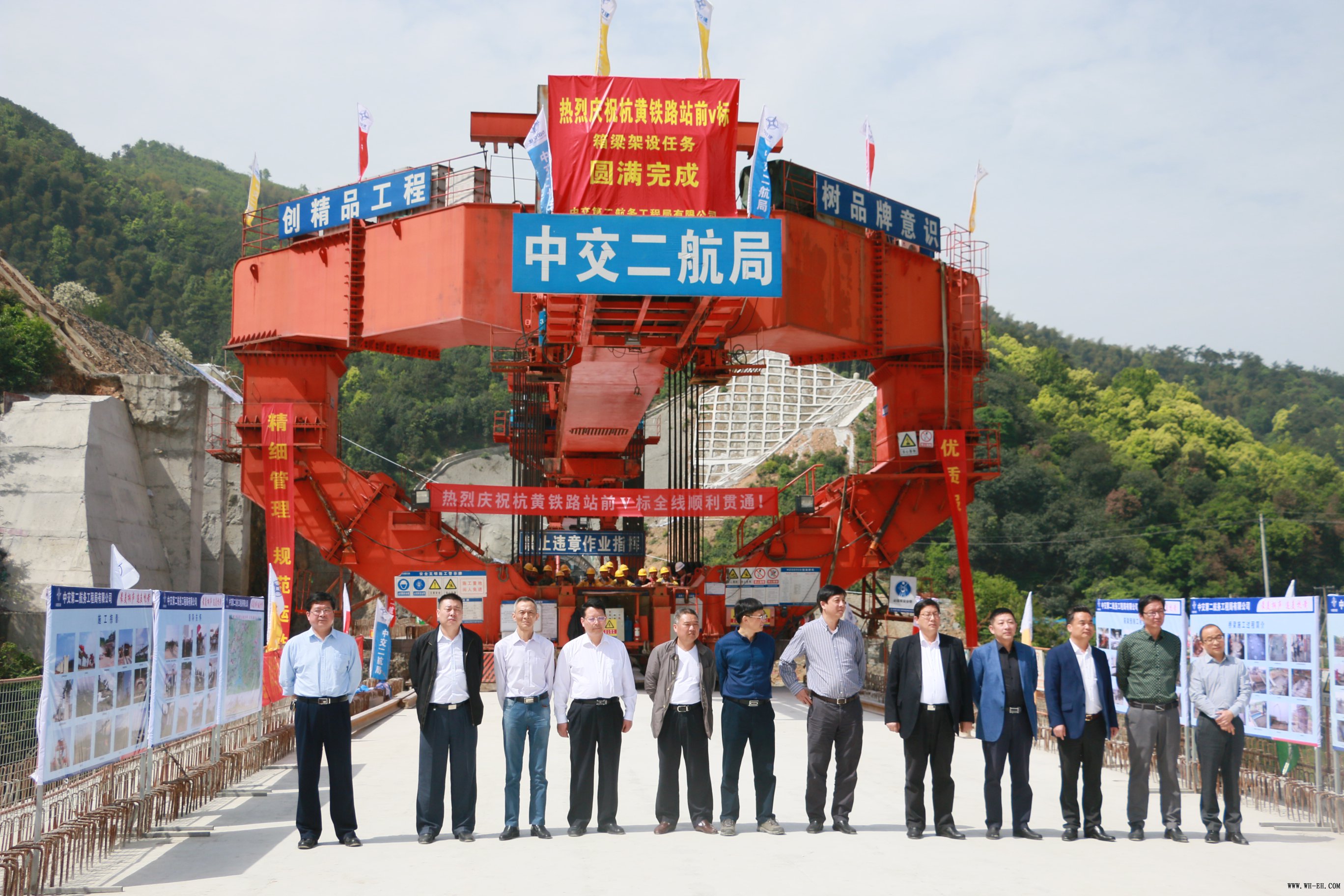 2017年4月19日,对中交二航局承建的杭黄铁路站前V标项目部全体员工来而言,是个值得庆祝的日子。上午10点18分,随着外蓬大桥最后一榀箱梁成功架设完成,现场烟花鞭炮齐鸣,标志着箱梁架设任务圆满完成以及该标段实现了全线贯通。参加此次架梁完成仪式的有二航局安全总监胡冬勇、杭黄公司总经理王志平、四公司副经理吴天寿、六分公司和装备分公司领导以及杭州市桐庐县、建德市政府相关领导等。