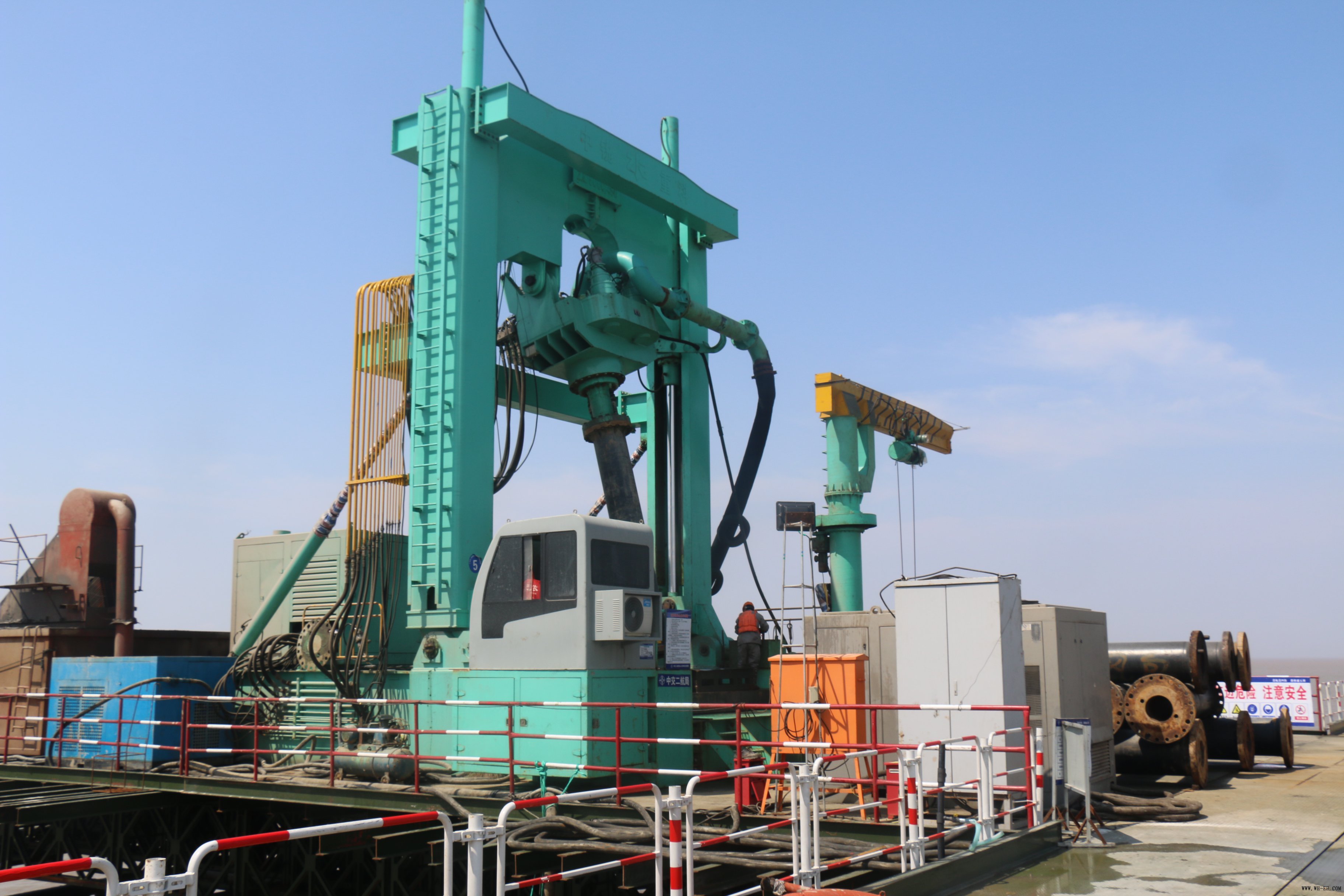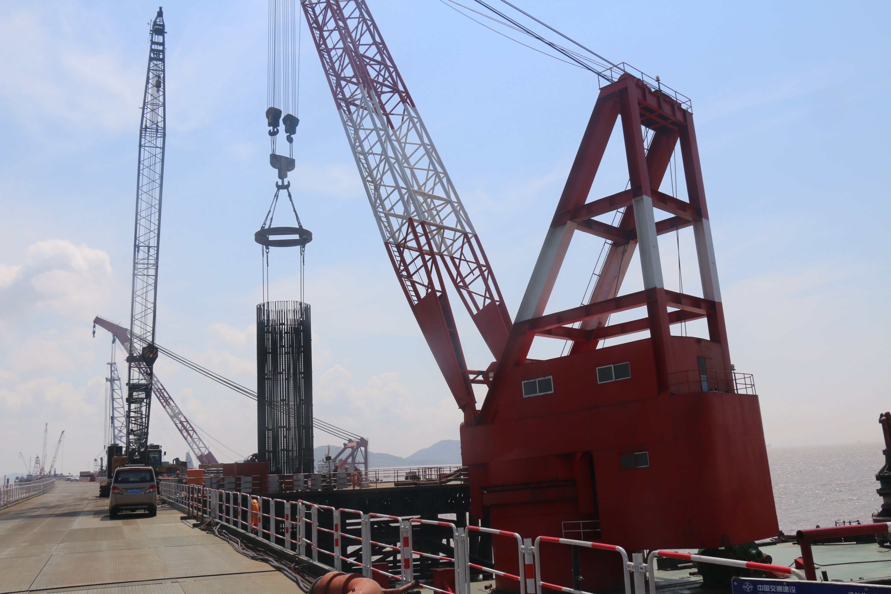 65号桩基永久性钢护筒重达255吨,长62.5米。在实际沉放时,施工海域涌大浪高,且设计图纸要求偏位小于3厘米,垂直度小于1/200。操作难度巨大,项目部经过多方论证,多次筛选,选用国内最先进的打桩船,采用GPS交汇测量技术,将钢护筒整体一次性沉放到位。