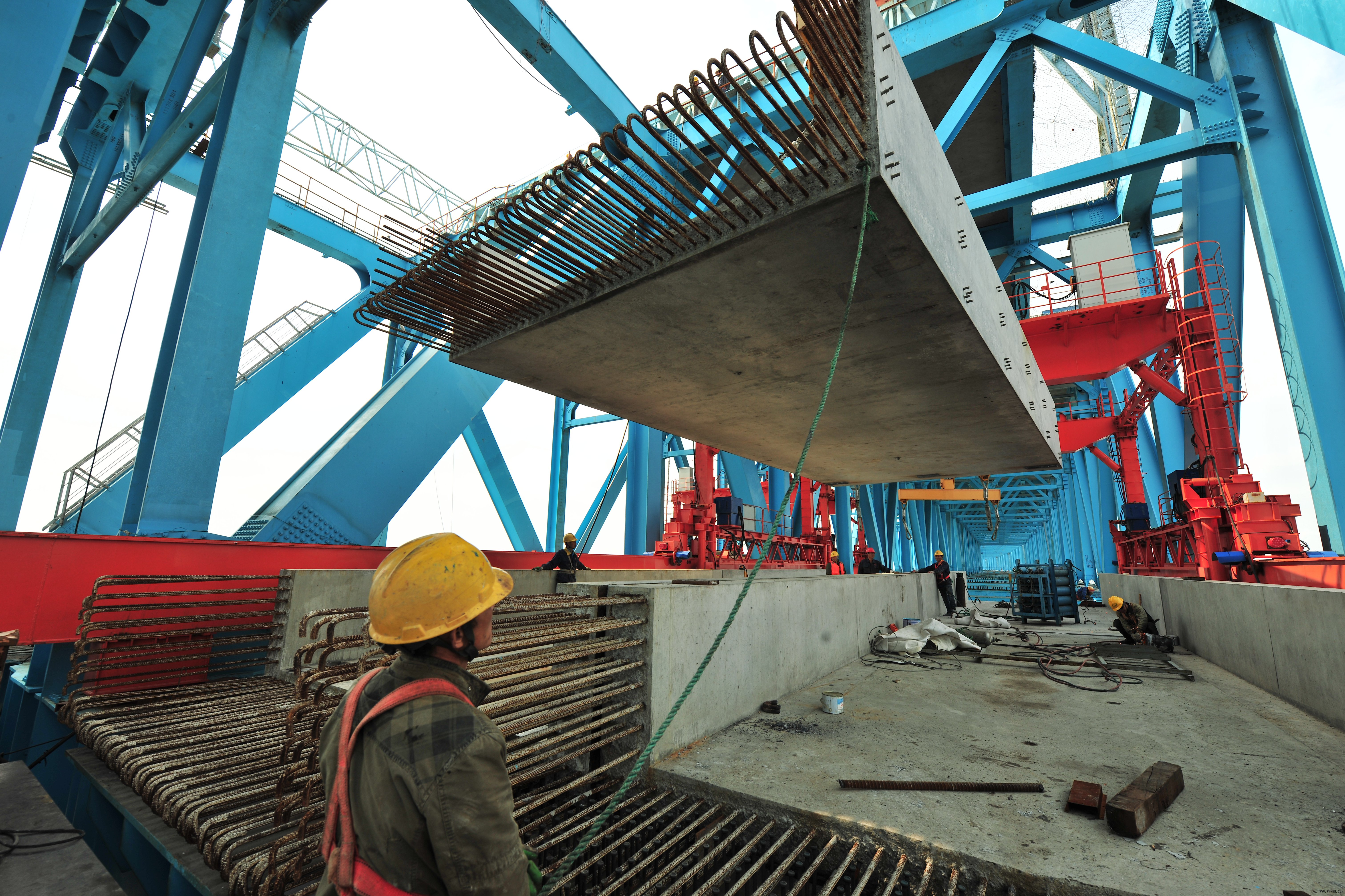 槽型梁从出厂到吊装,至少要经过4次倒运、7次起吊。在预制厂内预制完成后,由运梁车运至存放区。安装时,由运梁车运到码头,120吨的龙门吊吊至船上后,运往4号墩码头。然后再起吊,经运梁车运向安装现场。在现场,用上90吨的提升桁吊,吊至60米高空,穿越上层公路桥面预留的安装口,放入下层铁路桥面。最后,经铁路桥面运梁车运到预定位置安装。