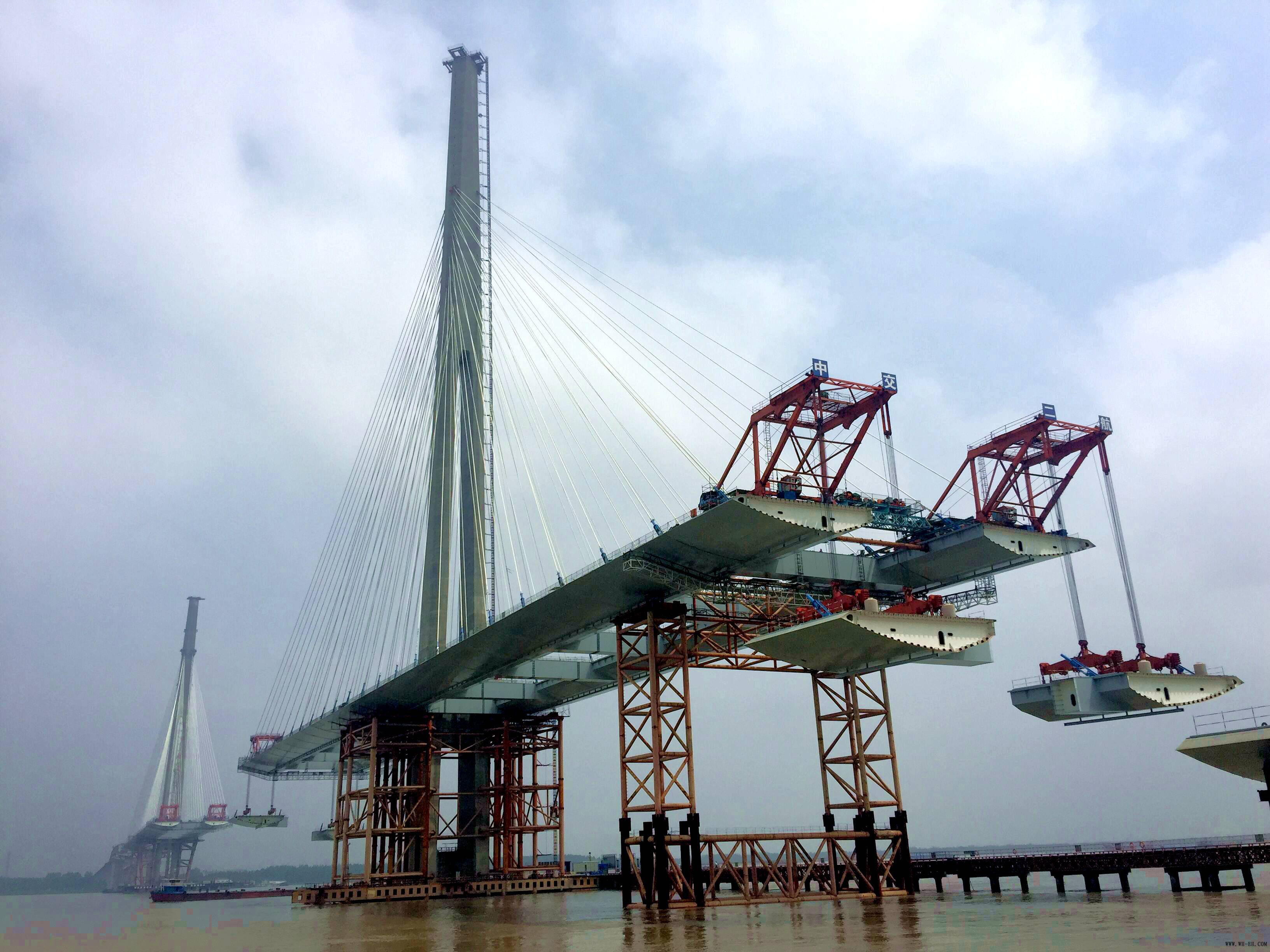 芜湖二桥主桥A2标由中交二航局承建,承担着南岸25对斜拉索安装,共计106榀(含合龙段)钢箱梁架设任务,13#钢箱梁的吊装标志着主桥钢箱梁架设任务完成过半,主桥钢箱梁的安装进入攻艰阶段。