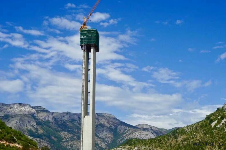 莫拉契查特大桥2-5号墩90米以下为单肢薄壁空心墩,90米以上为双肢薄壁空心墩结构,变截面设计,上部墩身单肢断面尺寸为16.442米(横桥向)×3.5米(顺桥向),采用液压爬模法施工。其中,2#墩身共分为27节浇筑,钢筋实用量1470.54吨,MB45砼浇筑10189立方,墩身高150.5米。