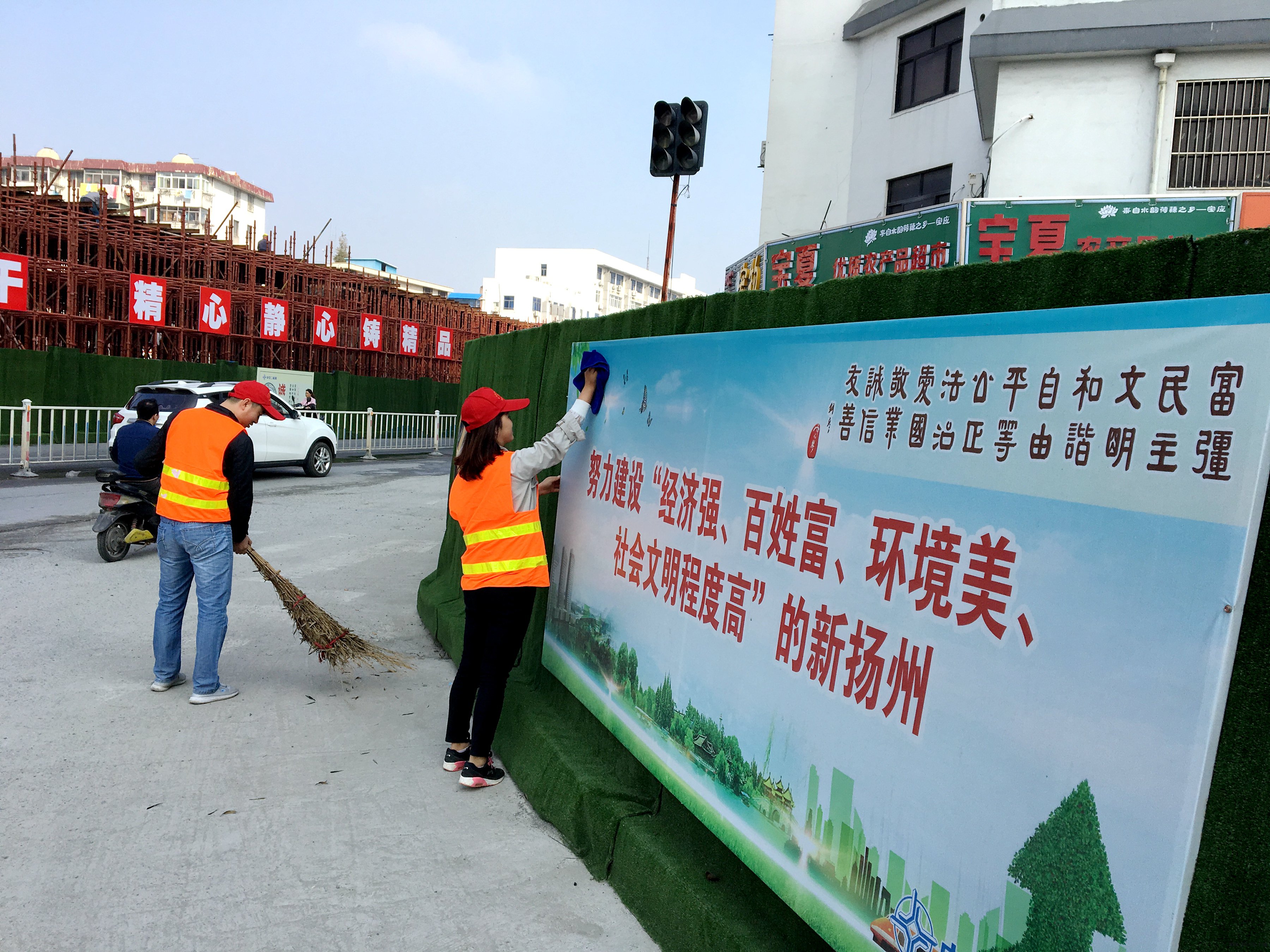 扬子江与江阳中路交叉路口,小红帽挥起双手,自愿引导来往车辆以及人员通行,俨然一位位刚出勤的交警。他们拿起扫帚,举起抹布,打扫扬子江隧道沿线的地面,清除围挡灰尘,为过往群众创造干净舒适的环境。