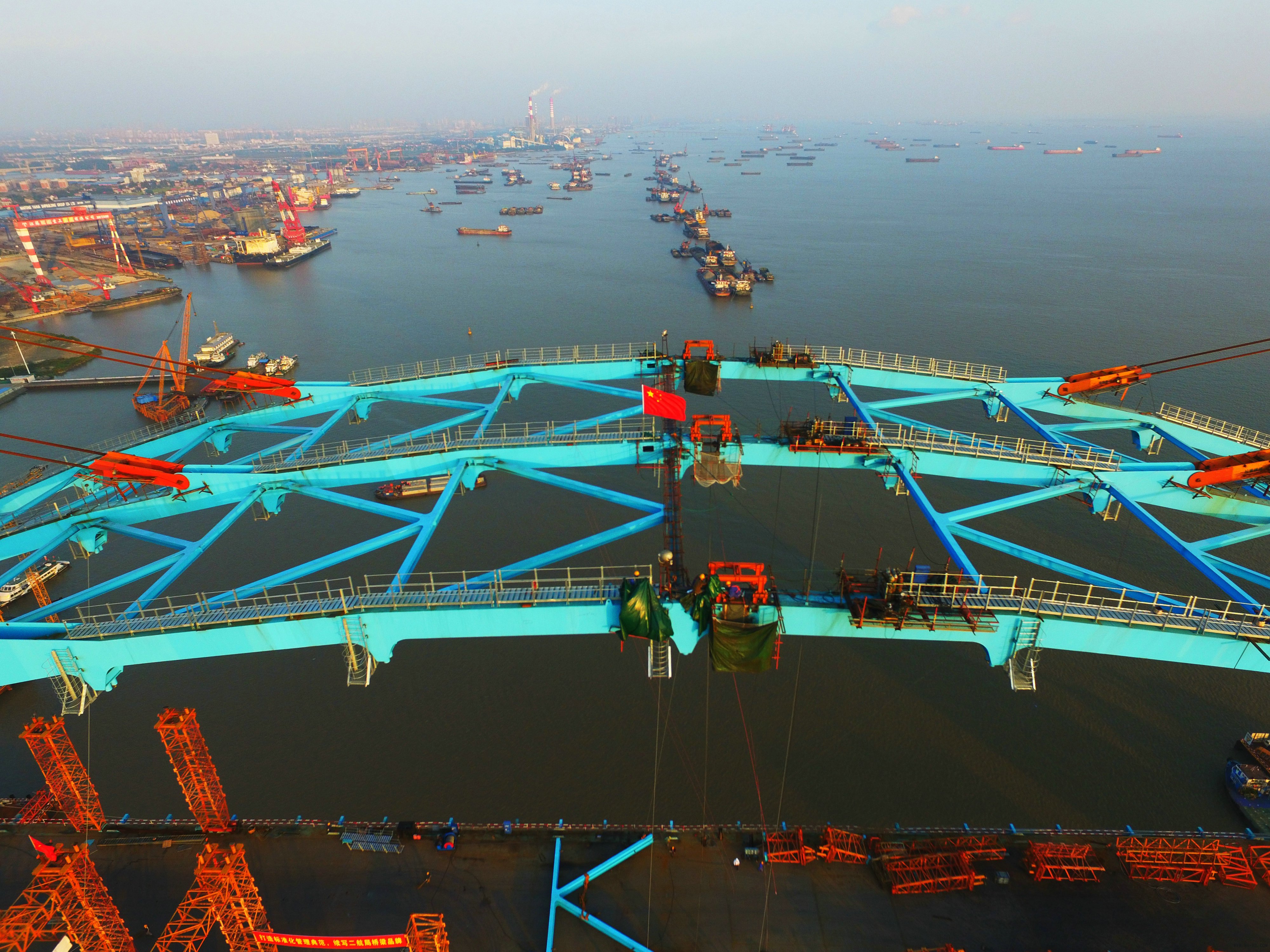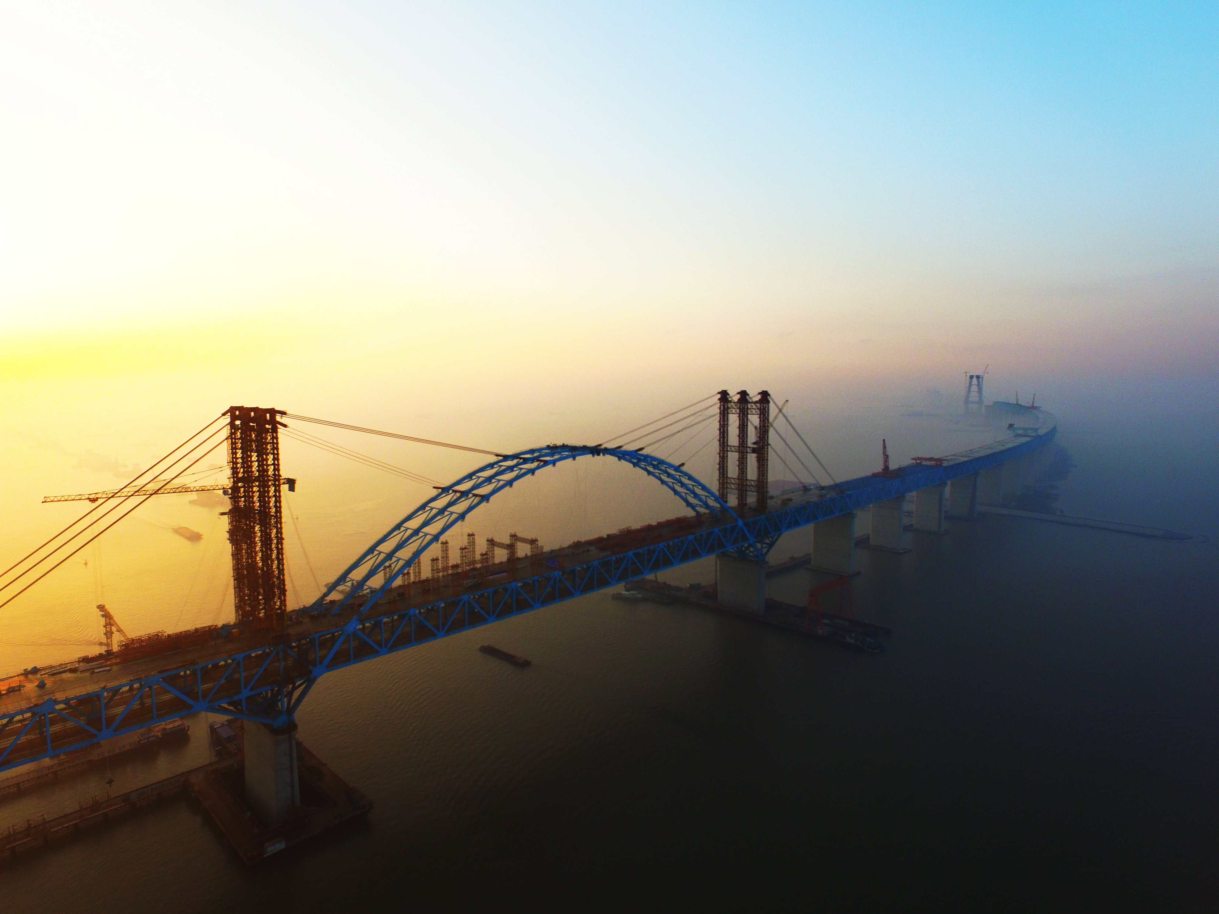 2017年10月22日,世界最大跨度公铁两用钢拱桥主拱合龙,这是继今年1月21日大桥钢珩梁合龙之后,取得的又一重大成果。标志着沪通长江大桥天生港专用航道桥全部成功合龙。