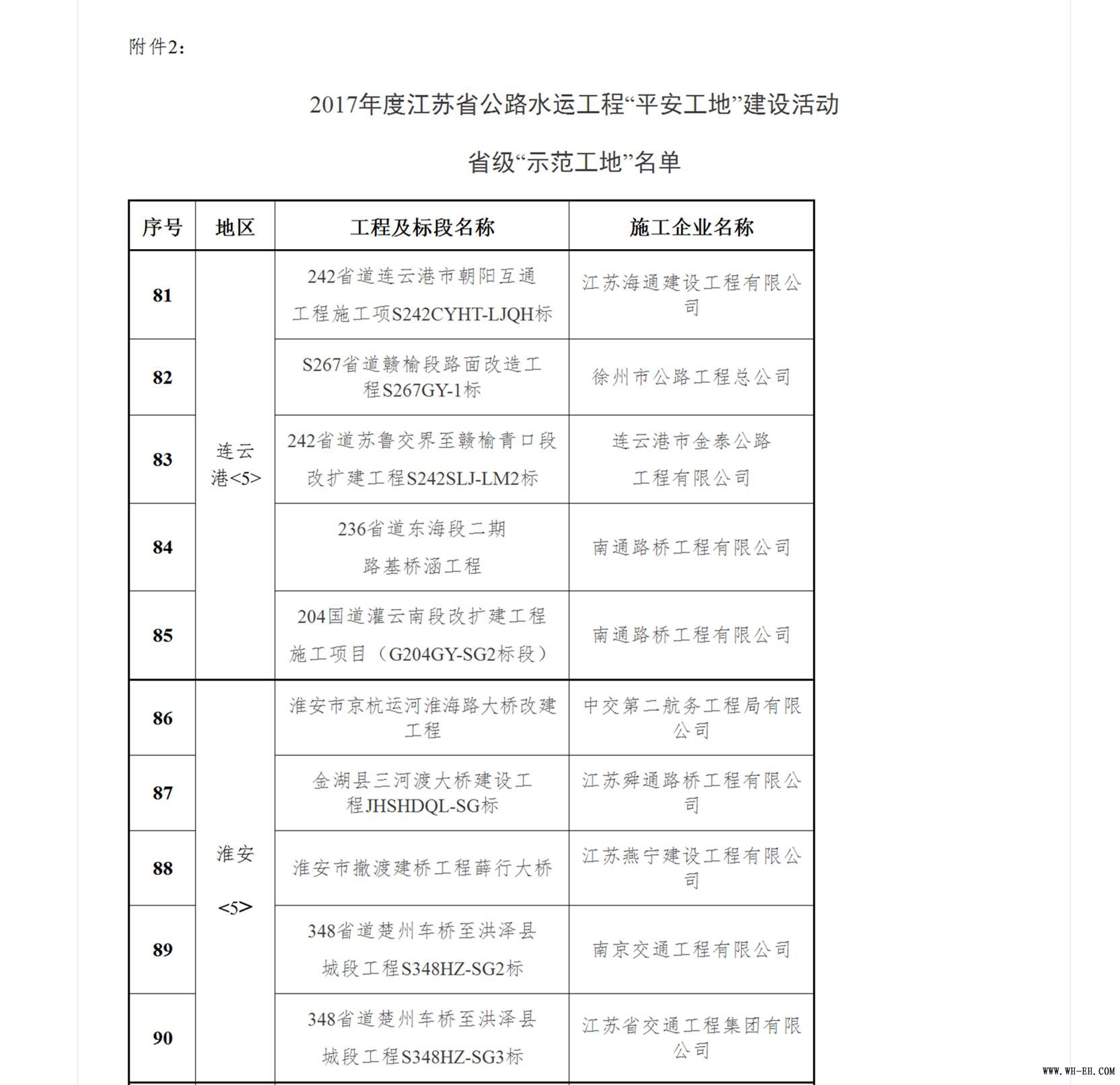 2018年1月22日,我公司承建的淮安市京杭运河淮海路大桥改建工程获江苏省公路水运工程“平安工地”建设活动省级“示范工地”荣誉称号。
