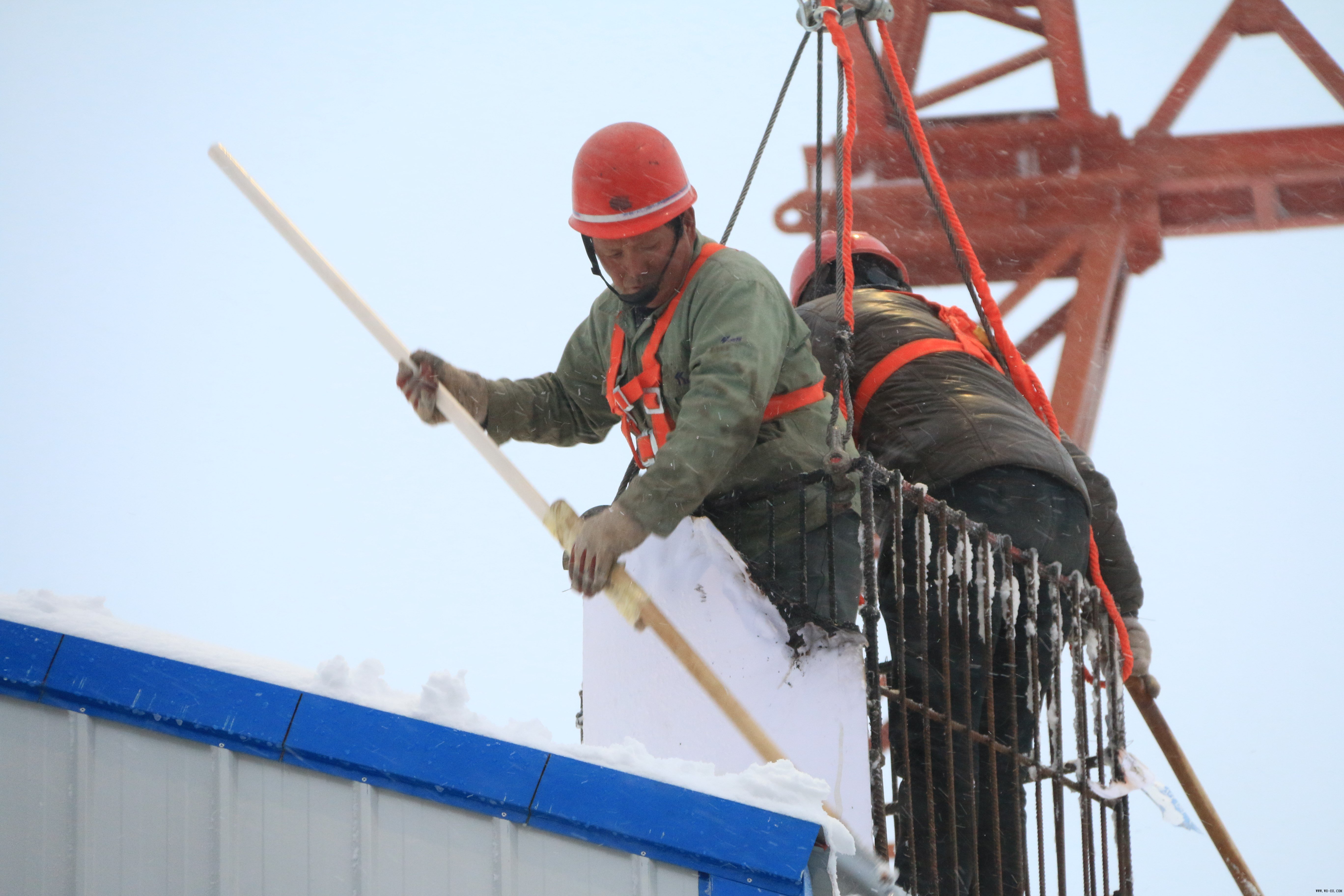 到了傍晚时分,大雪依旧在下,场区内的台座顶棚和搅拌站的料仓顶棚上的积雪也越来越厚。为防止顶棚坍塌,除雪队伍连夜清扫积雪,保护生产台座和料仓顺利度过这场暴雪。