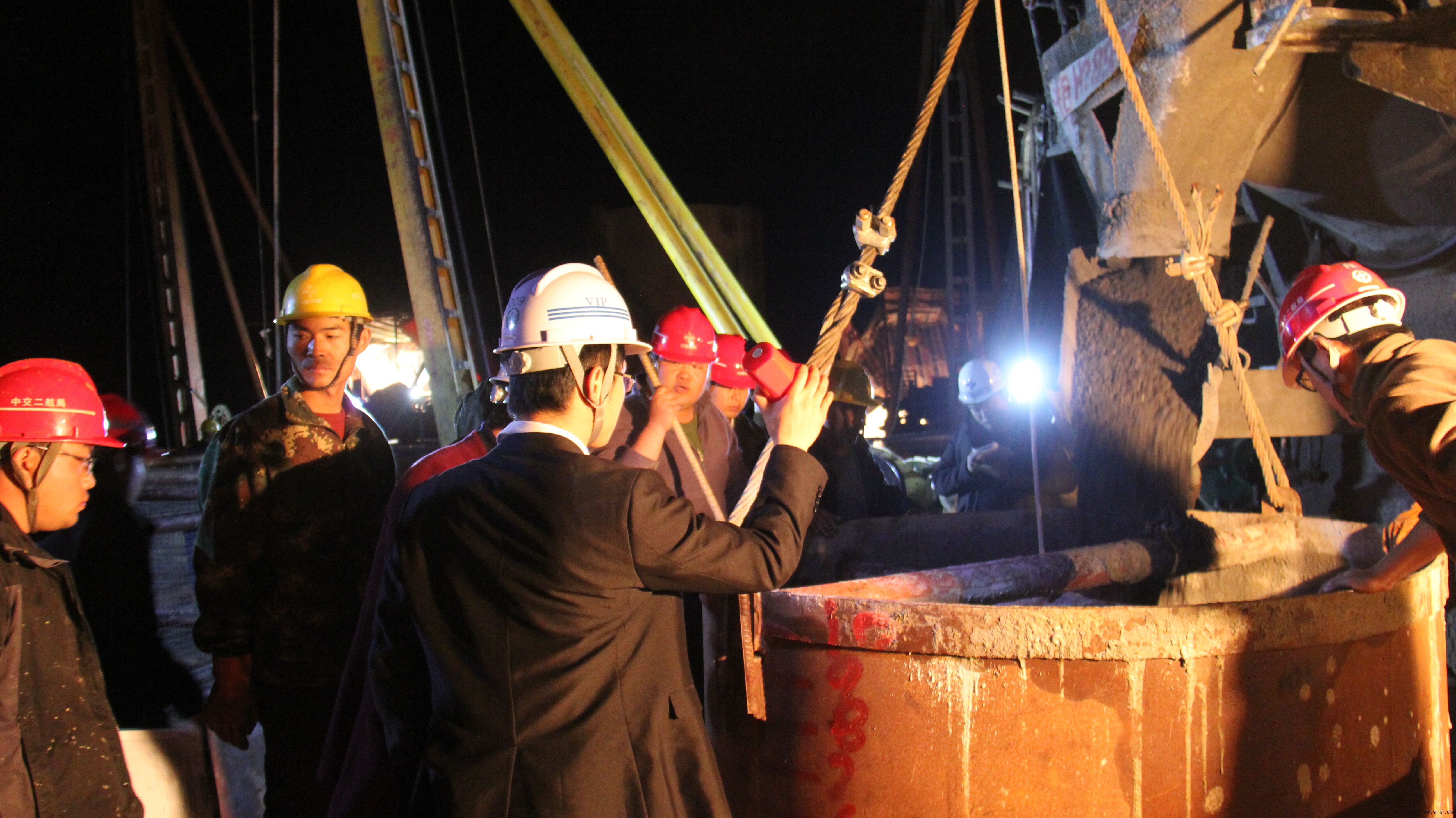 大桥共四个主桥墩,都由9根钻孔桩组成。首根主墩钻孔桩编号为20号墩左幅3号桩,桩长45米,孔深66.6米,采用冲击钻施工。为确保施工质量,项目部实验室人员用混凝土试块实验和坍落实验等检测手段,随时监测混泥土数据,确保数据达标方可施工。大桥技术主管钱杰兼顾南北两岸的施工,片刻不离现场已近40小时。