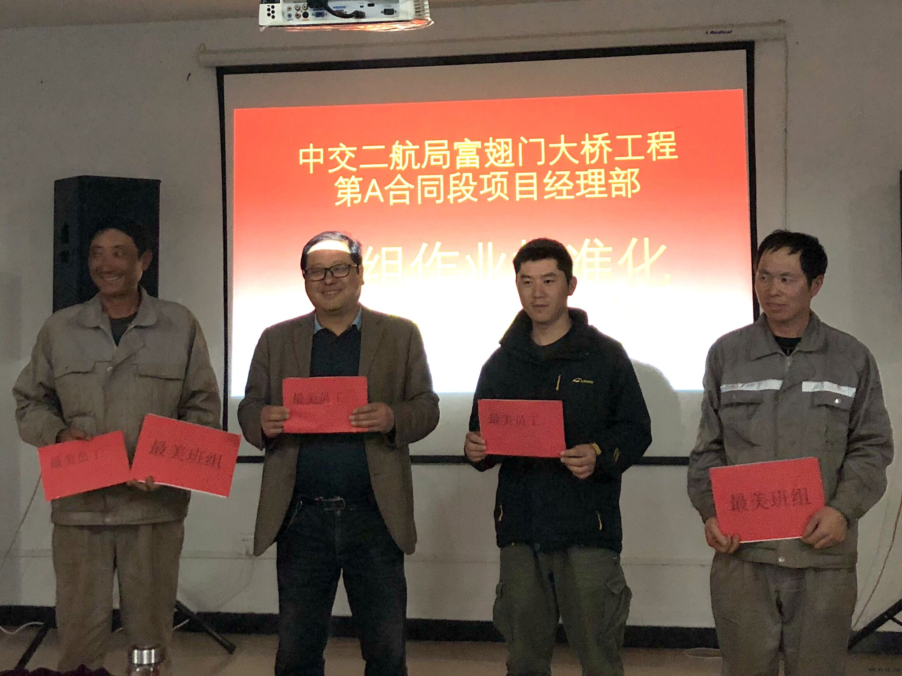 3月31日,为积极响应主通道工程建设指挥部立功竞赛活动,进一步推动项目部班组作业标准化,富翅门大桥项目部召开一季度班组作业标准化表彰仪式,对表现优秀的班组和个人进行了奖励。
