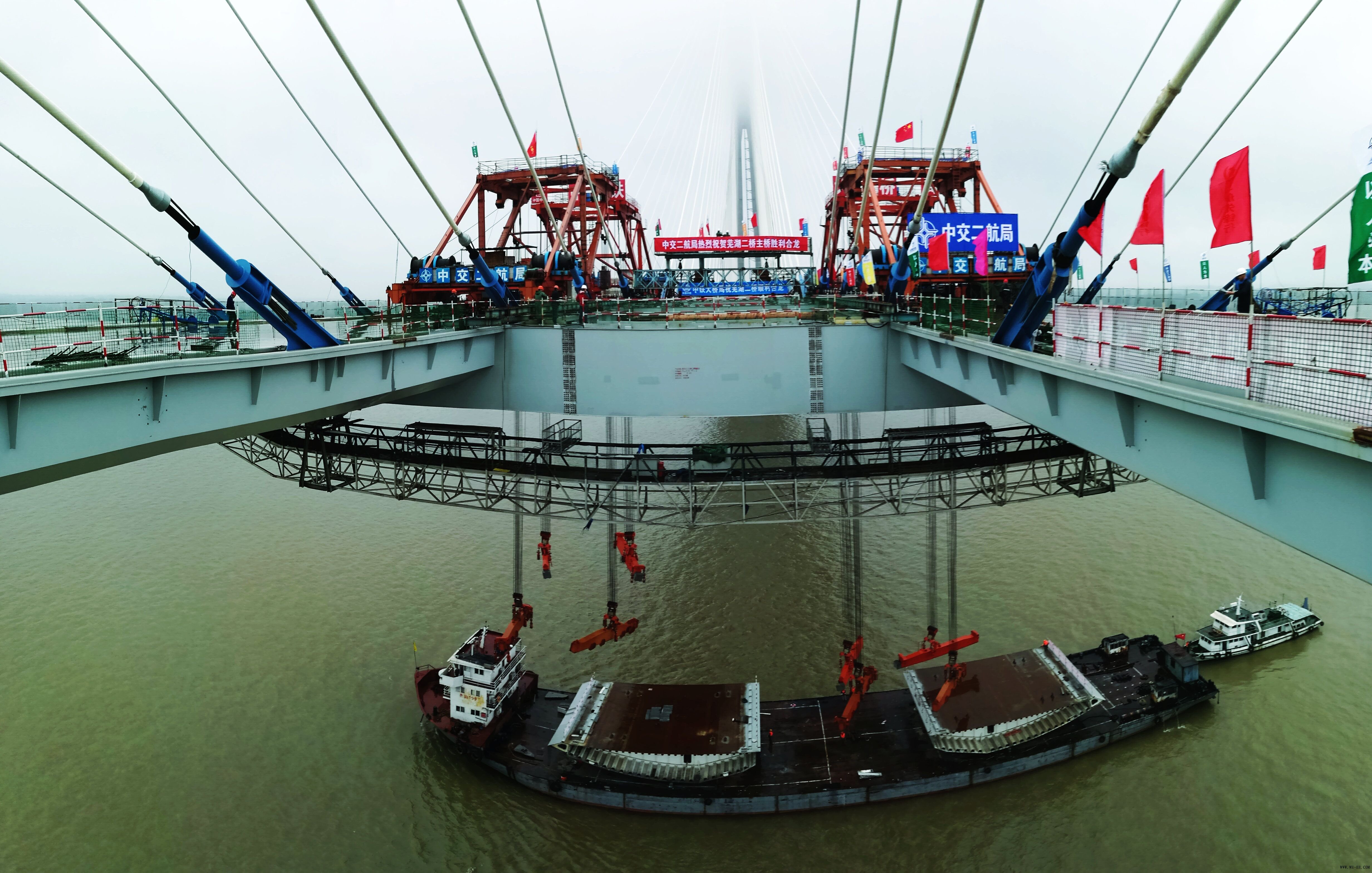 阴雨霏霏,芜湖二桥为合龙做最后定位准备。