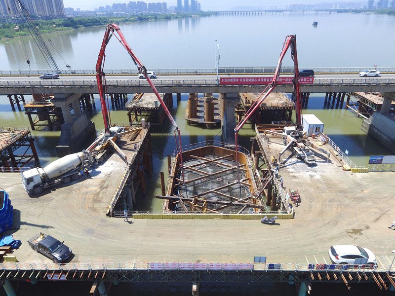 为避免对闽江河水造成污染,中交二航局两洪桥项目部决定让混凝土搅拌工序远离江岸,选用商用搅拌站进行混凝土供应。但这也增添了施工难度,从搅拌站到现场,混凝土运输时间长达1.5小时,且面临着早晚高峰禁行的压力,故现场混凝土浇筑大部分在晚上进行。