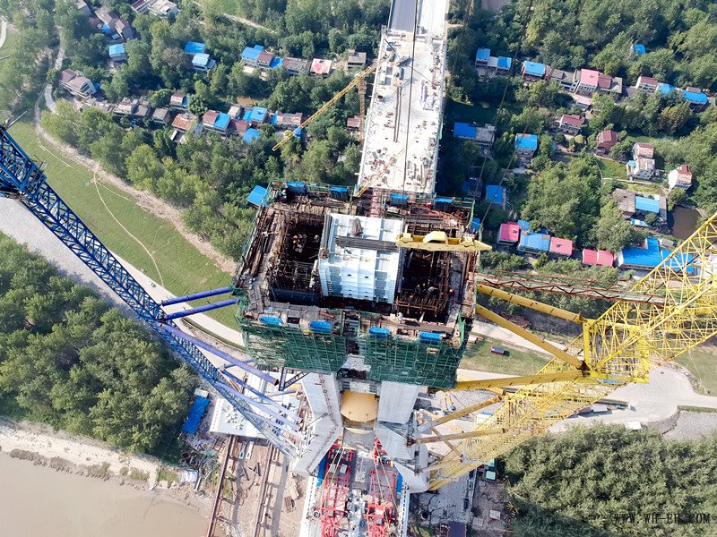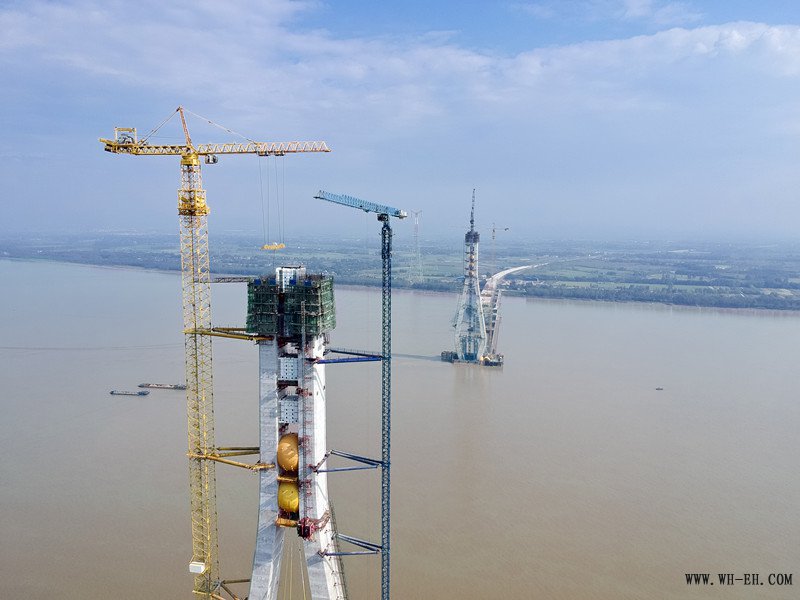 池州大桥主塔设计为花瓶形钢筋混凝土结构,高237 米,由下、中、上塔柱及上、下横梁几部分组成。其中塔柱为钢筋混凝土结构,上横梁为钢结构,下横梁为预应力混凝土结构。上塔柱高92.2米,两上塔柱之间通过采用箱形结构形式的6 道钢横梁连接。钢横梁高约7米,单块最大重量为68吨,总重315.1吨,采用MD3600 塔吊分四块依顺序分别进行吊装。