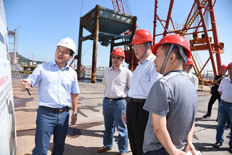 随后杨建中来到位于191.5米塔柱顶高北主塔塔顶,俯瞰全桥,听取了主塔液压自爬模施工技术、沉井三次下沉施工和基底三维声呐探测技术等关键部位施工工艺介绍。