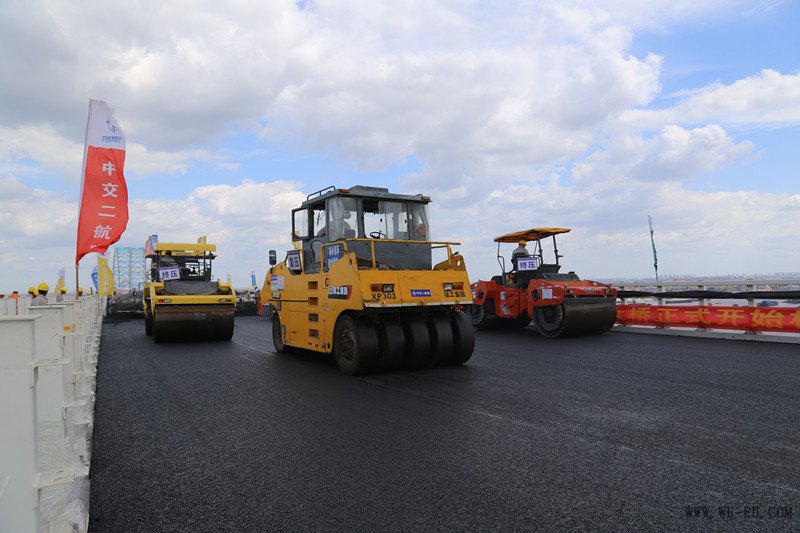 9月25日上午,由中交二航局承建的沪通长江大桥I标段公路桥面上热浪滚滚,沥青摊铺机平稳匀速地缓缓前进,正式拉开了大桥桥面沥青摊铺工序的序幕。