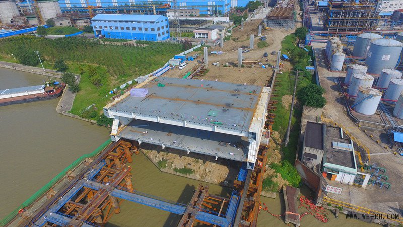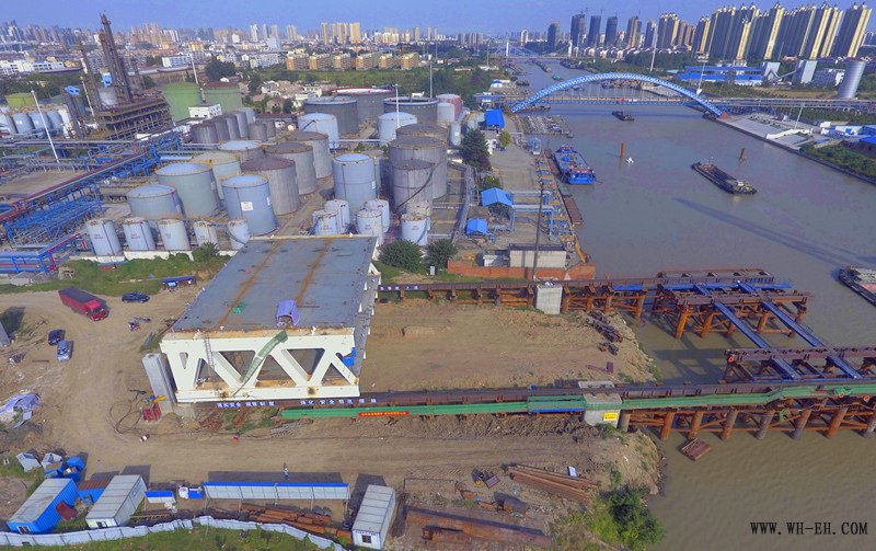 这是淮安市快速路一期工程6标段京杭运河大桥首节段钢桁梁顶推滑移施工,通过两台200吨的连续千斤顶的牵引,将整个重达1128.8吨的钢桁梁节段由中跨顶推滑移至边跨的设计位置。本次滑移的首件Z7节段,由8块钢构件通过600吨浮吊船依次吊装至中跨拼装区焊接而成,其中上下两层桥面板共6块,左右侧钢桁梁共2块,是整座桥梁顶推滑移距离最长、耗时最久的节段。