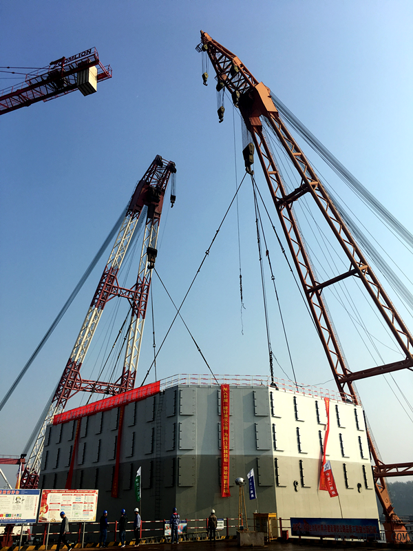 经过吊装前紧张有序的准备工作后,7时54分钢套箱正式起吊,由起吊功率600吨的宁航工528#和起吊功率400吨的宁航工306#浮吊起重船担任吊装任务。随着急骤的指挥哨声,钢套箱缓缓升高,在吊离水面0.3米时停止10分钟,进行试吊观察钢套箱是否变形及吊点焊缝情况,有无异常变形及焊缝有无开裂,此时运输船在钢套箱底部慢慢驶离。在现场指挥和施工人员的紧密配合下,两艘起重船进行平稳移动,于8时58分使钢套箱顺利到达位置。在震天的欢庆鞭炮声中,完成了当天18#主墩钢套箱的沉放施工。