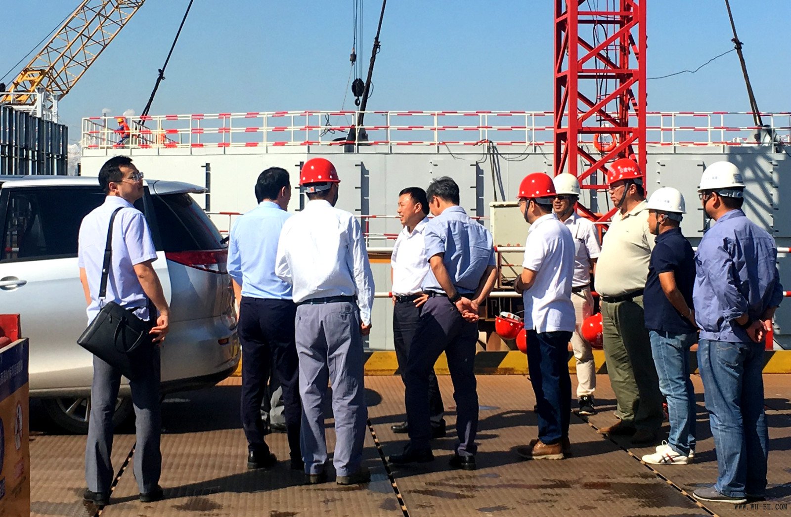 在9月29日已顺利完成的浦仪大桥18#主墩钢套箱沉放施工平台上,邢市长等领导在展板前,认真听取了公建中心总工程师章登精汇报工程建设进展情况,并近距离的来到主墩钢套箱前,询问了施工过程中的问题,对二航局在短时间内进入全面施工状态,并提前完成主墩节点目标表示满意。临行前邢副市长与公建中心主要领导、以及施工方职工亲切握手道别。