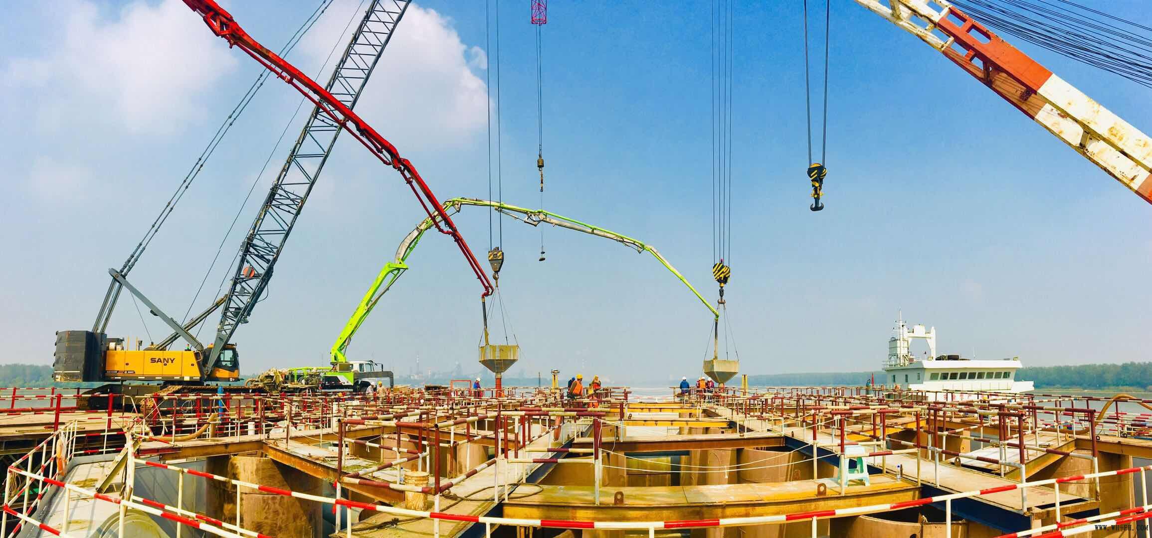 浦仪大桥18#主桥墩基础是采用钢围堰进行施工,也是大桥唯一在江面上进行施工的主桥墩。上午9时许,钢套箱混凝土封底混凝土浇筑施工正式开始,一时间水上施工平台和钢栈桥上的混凝土输送车穿梭来往,混凝土浇筑现场施工人员有条不紊忙碌着,有的在指挥泵车泵送混凝土,有的在用测绳紧张的测量混凝土浇铸高度,现场的高空塔吊、履带起重吊、起重船浮吊等起重设备忙个不停,18#主墩平台上人来车往一片繁忙景象。