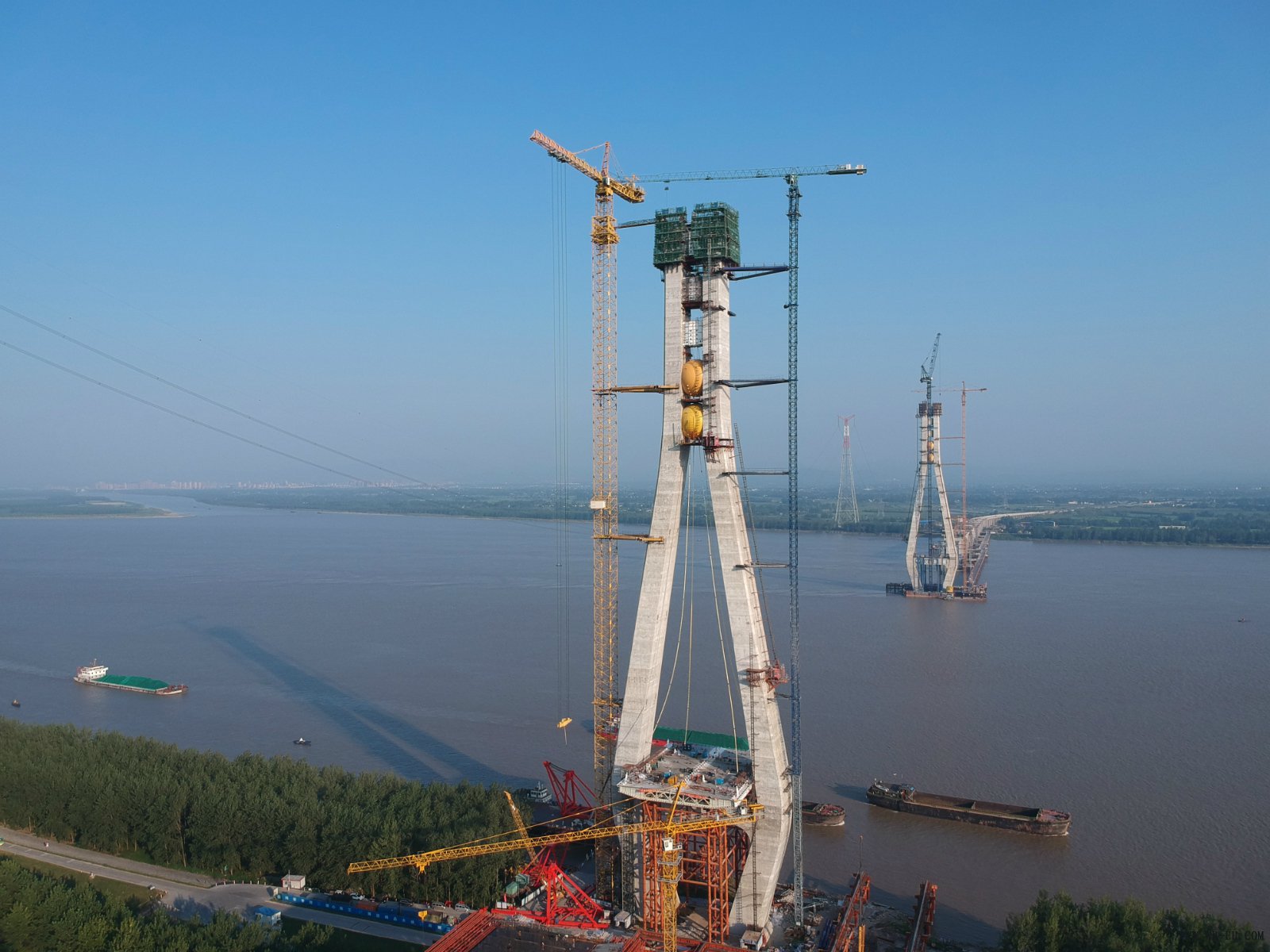 大桥北主塔高237米,相当于90层楼的高度。采用内外层不同性能混凝土的复合技术,内部为普通混凝土,外部为36厘米厚的皮肤功能混凝土。据项目副经理介绍,北主塔共浇筑皮肤功能混凝土5500余方,普通混凝土近30000余方。与普通混凝土相比,皮肤功能混凝土看上去更白,触感也较为“细腻滑溜”,真有些“皮肤”的感觉。