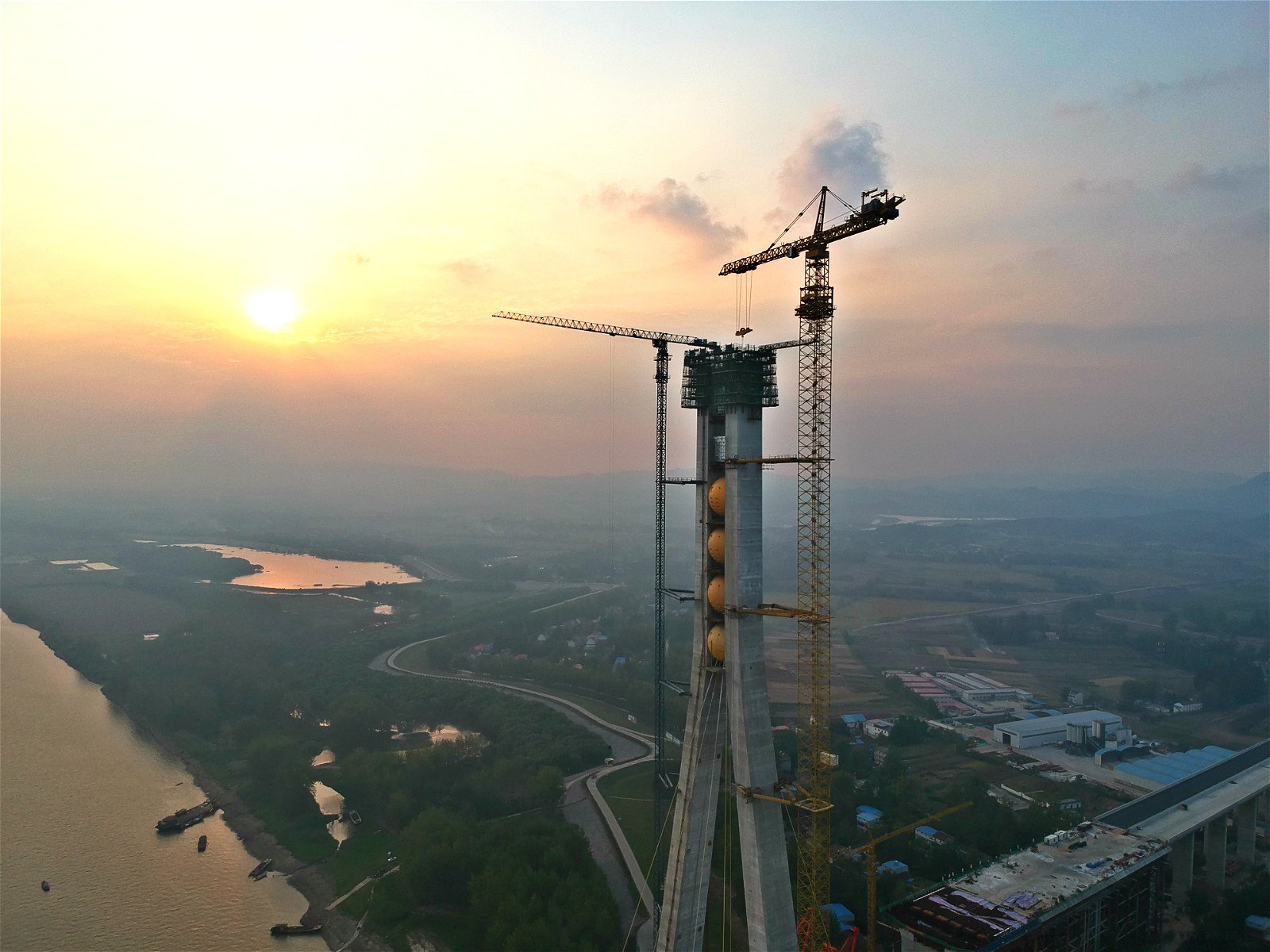 大桥主塔两上塔柱之间通过6 道钢梁连接,108根斜拉索分六组集合,分别依次从6颗琉璃黄色钢球中穿过,锚固于上塔柱六道钢横梁上,整体呈放射状伸向桥身。避免传统施工中主塔被拉伸的困扰,不仅解决了锚固区混凝土开裂问题,更能“拗造型”,从150多米到220多米高空穿出的金色拉索,犹如万道“佛光”,普照在八百里皖江上,阳光下熠熠生辉,气势非凡。