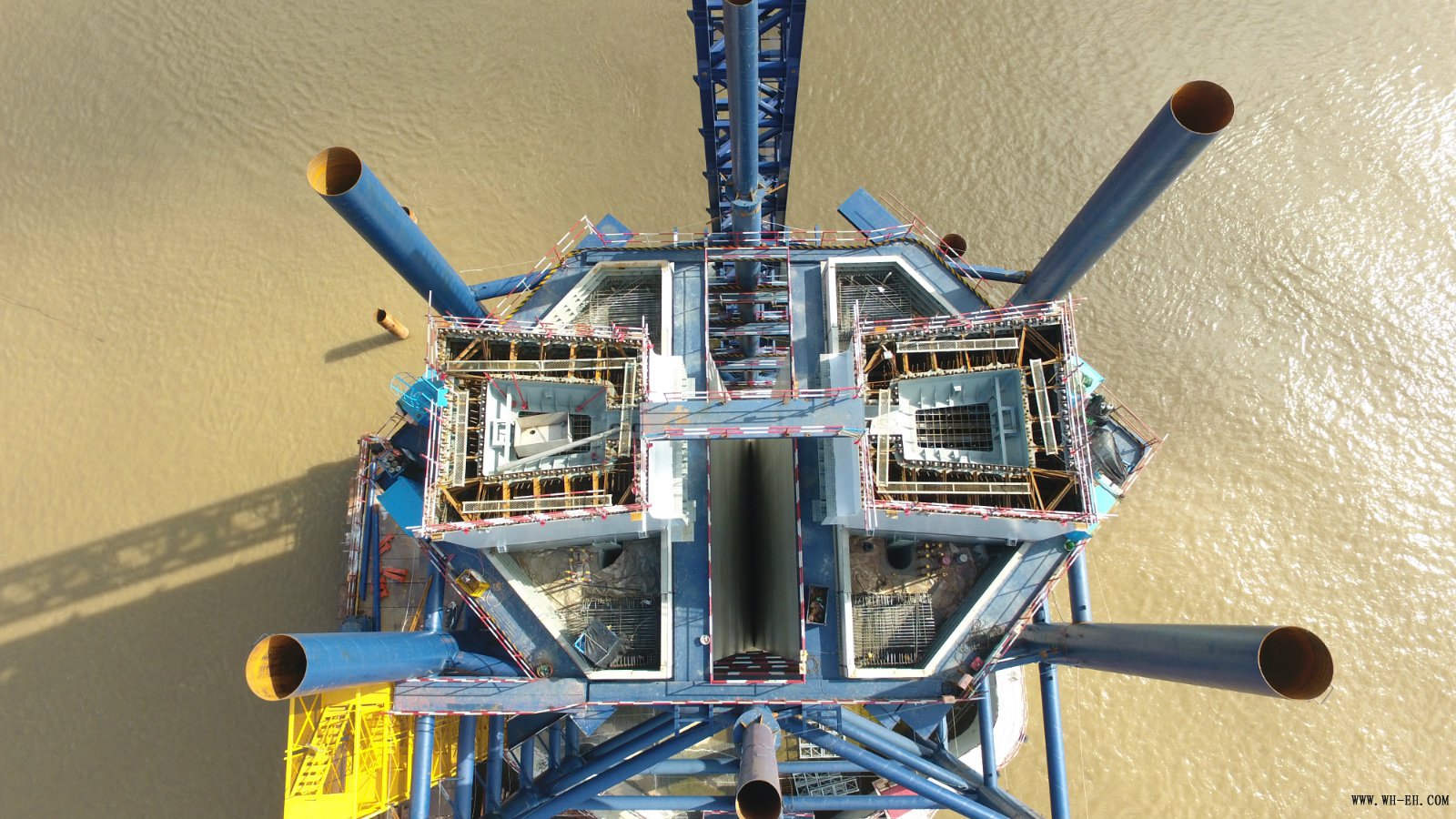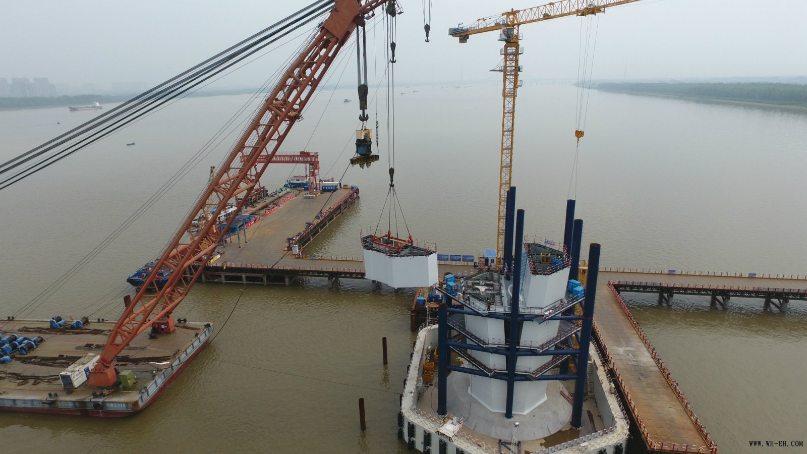 为最大限度实现工厂化、装配化加工,项目创新工艺功法,钢混组合索塔钢壳节段在工厂内加工,索塔钢筋在钢壳加工时同步安装,桥位现场安装钢壳节段,连接竖向主筋接头即可。下塔柱钢壳节段重180吨,采用起重船吊装,中上塔柱钢壳节段最重100吨,采用2000吨•米塔吊吊装。钢壳吊装后,连接匹配件及竖向主筋、焊接内外壁板后即可浇筑混凝土。下塔柱作业平台利用箱梁0#块支架,中上塔柱作业平台采用专门设计的液压爬升操作平台。