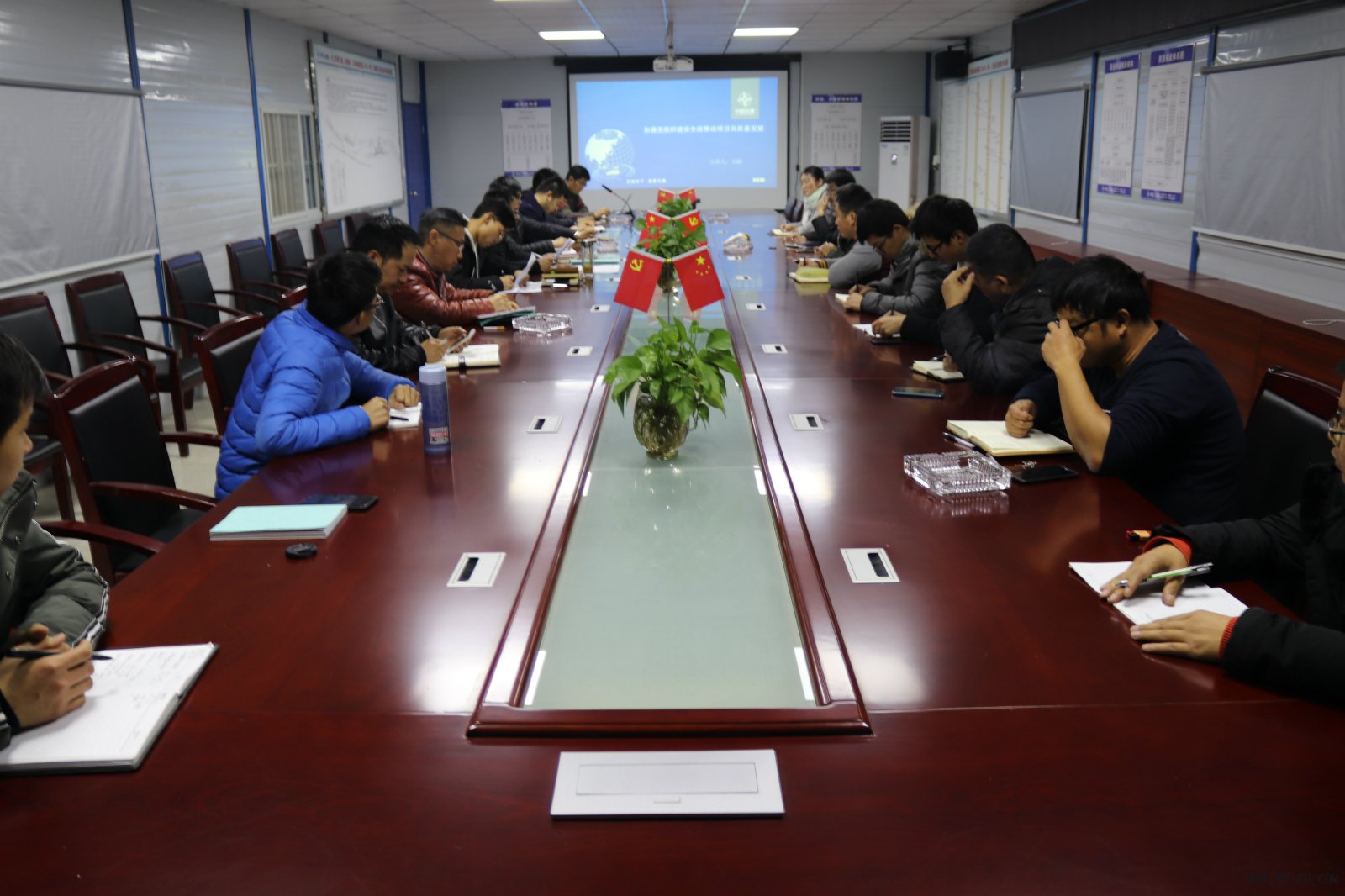 2018年12月19日晚,引江济淮工程(安徽段)江淮沟通段施工J012-1标项目部会议室,全体党员、入党积极分子、领导班子成员及各部门负责人等二十余人,参加了由支部书记刘群、支部副书记颜兆东主持的党建工作会及党课学习会。