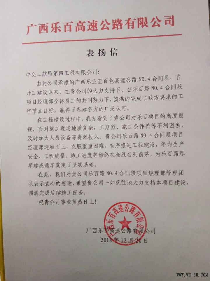 与此同时,乐百项目收到了一封来自广西乐百高速公路有限公司的表扬信。在信中,肯定了项目部在面对施工现场地质复杂,工期紧、施工条件差等不利因素时,及时加大人员设备等资源投入。并大力赞赏了项目经理部迎难而上,克服重重困难的精神,有序推进了工程建设,年内生产安全,工程质量、施工进度等始终在全线名列前茅,为乐百路尽早建成通车奠定了坚实基础。